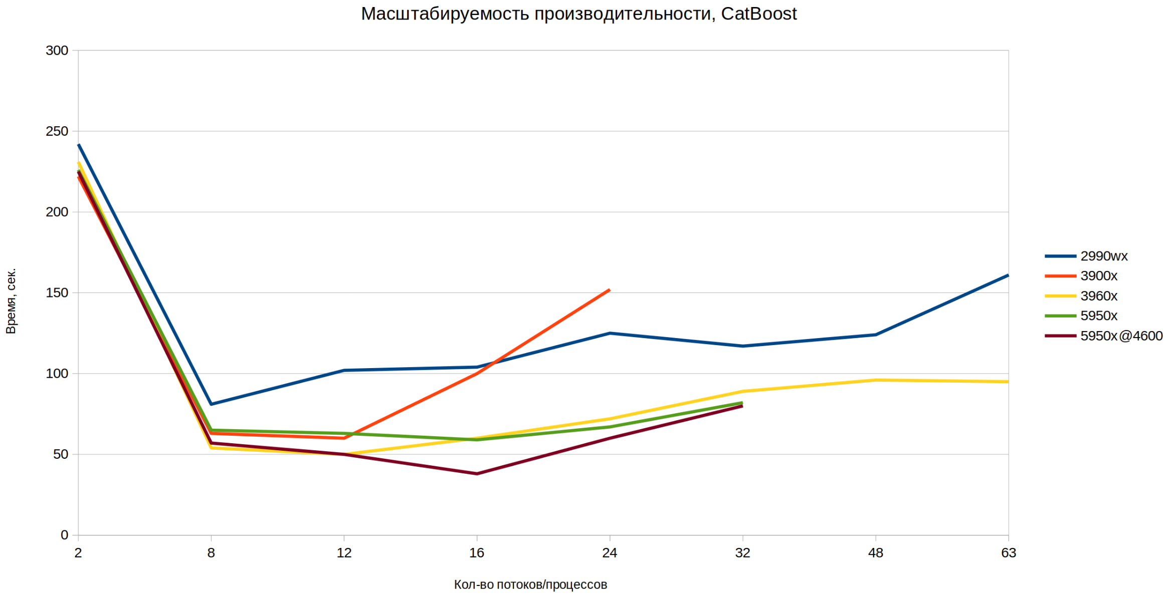 Тут опять же, после 8 потоков (да, тут уже потоки, одно адресное пространство и одни переменные) скорость увеличения производительности значительно снижается. При этом код более-менее оптимизирован. Однако, если мы взглянем на отмасштабированную картинку, увидим, что разница в эффективности процессоров значительная. Вдумайтесь, на 32х потоках 5950х в разгоне в 2 раза обошел 3960х! И при этом его кривая монотонная - то есть невооруженным взглядом видно, что производительность растет при введении в бой новых ядер процессора. - Catboost: