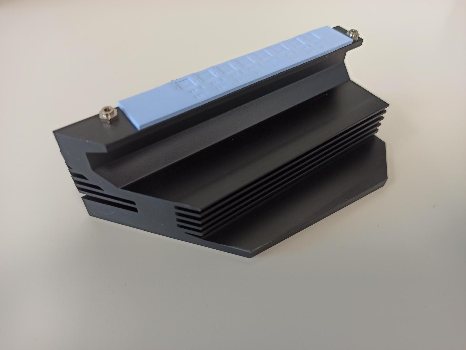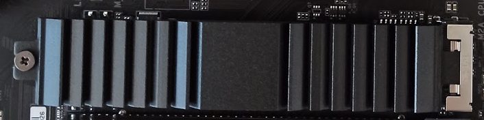 Система хранения представлена 4-мя SATA разъемами и двумя m.2 разъемами, позволяющими использовать как NVMe так и SATA m.2 накопители. Верхний m.2 разъем накрыт алюминиевым радиатором с декоративным оребрением и терпмопрокладкой: