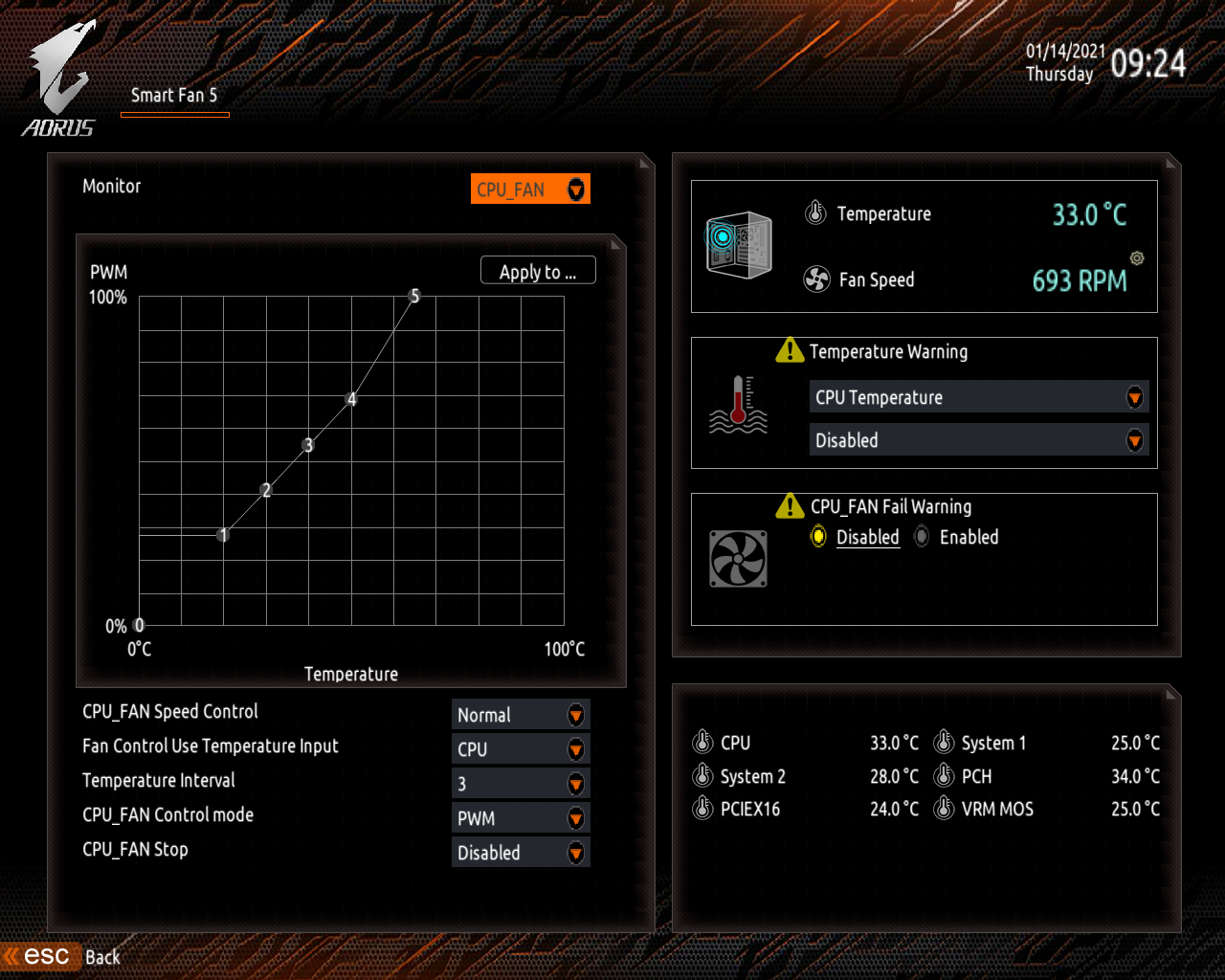 Присутствует стандартный регулировщик оборотов вентиляторов. При этом мною не было замечена возможность плавной перестройки частот вращения, зато есть возможность настроить предупреждение о высоких температурах и выходе из строя вентилятора. У меня не было бипера, чтобы проверить.