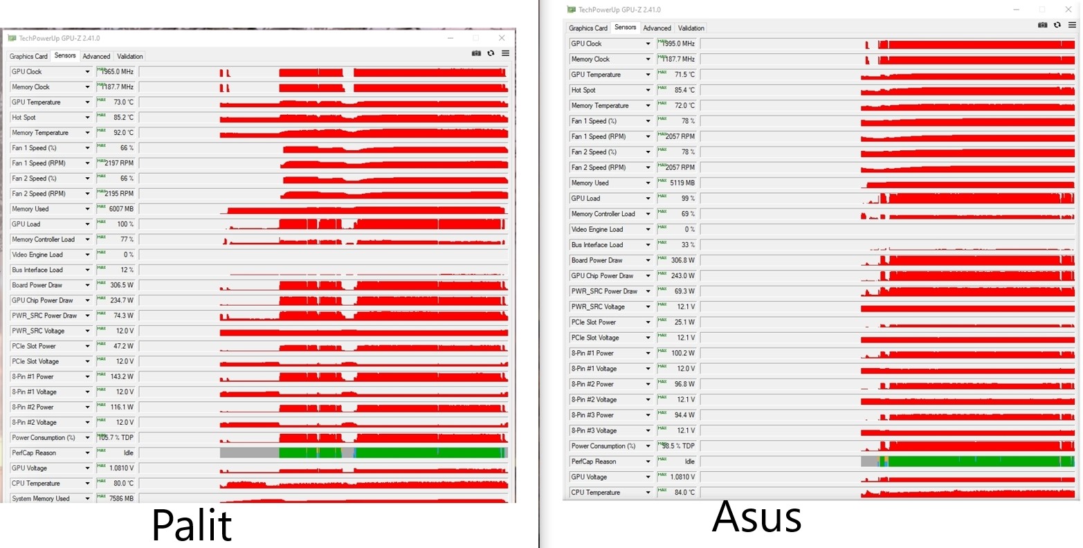 Внимательные читатели уже заметили, что GameRock в отличии от Strix'а не упирается в PL и наверняка скажут: "Ну так оно и понятно. поэтому и такие температуры, если бы не эти 105Вт, а 98Вт (Asus Strix), то было бы намного ниже". Возможно, вы правы и эти 7Вт разницы отбили бы разницу в ~20C' на чипах памяти и температура GPU была бы куда ниже и скорость вертушек была бы тоже ниже 🤭 , но, повторюсь, мы рассматриваем вариант "из коробки", когда работает принцип "Поставил карту и Слава Богу, что работает".