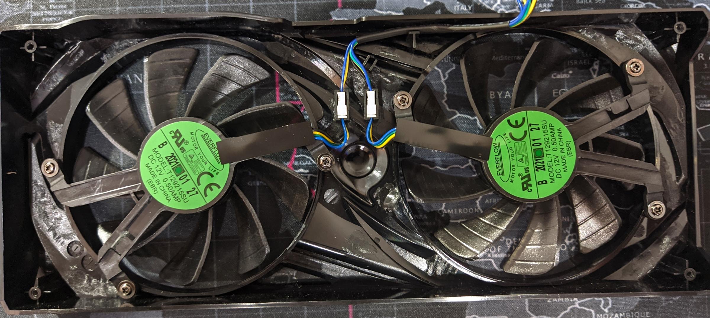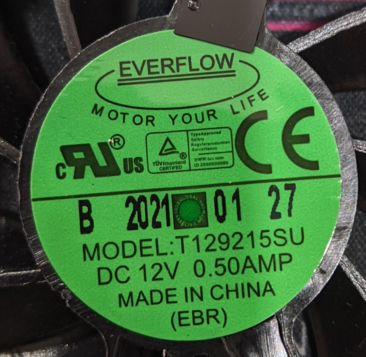 За охлаждение видеокарты отвечают два 87-мм 9-ти лопастных вентилятора с маркировкой T129215SU от компании Everflow. В интернете удалось найти информацию, что данные вентиляторы основаны на гидродинамическом подшипнике (FDB). К сожалению, информации об официальном сайте найти не получилось.