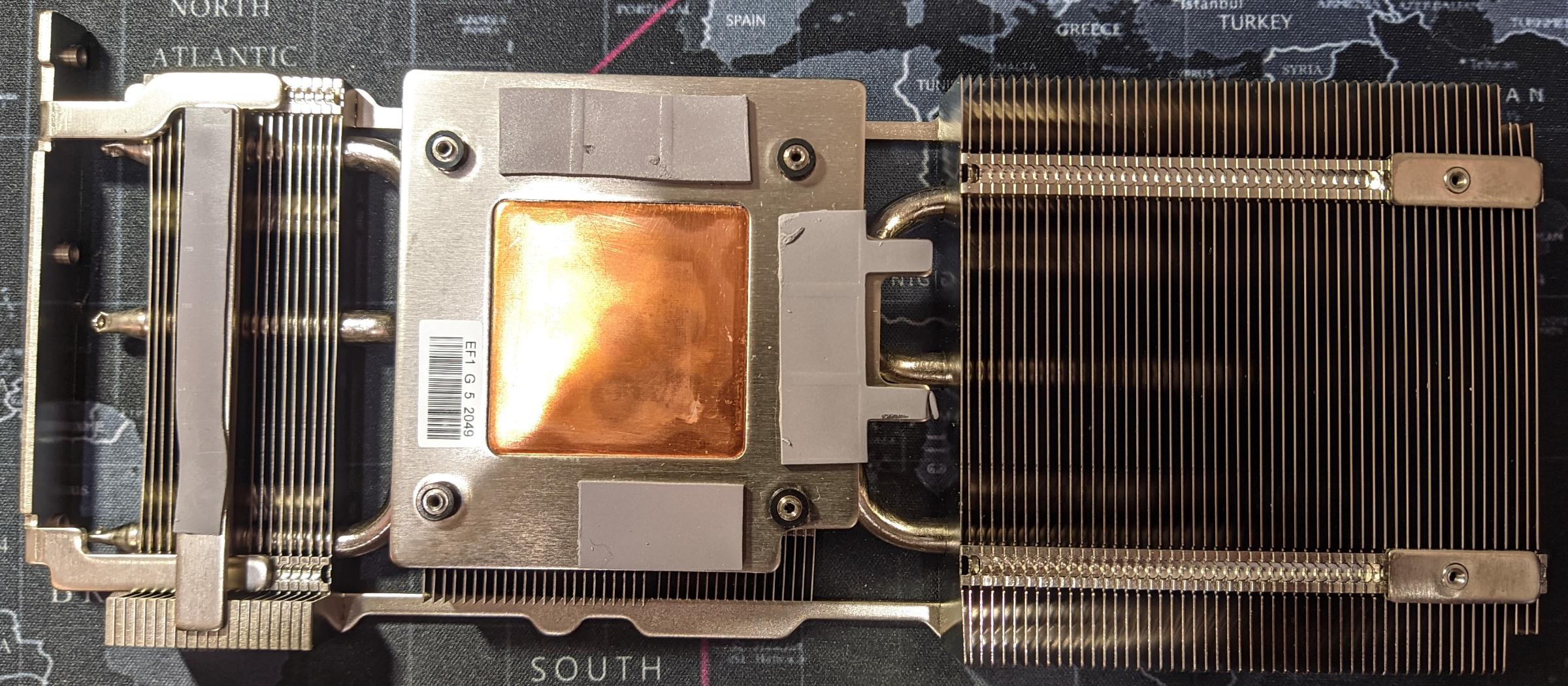 Отвод тепла от чипов памяти и зон VRM на радиатор осуществляется через термопрокладки толщиной 1.7-2 мм на чипах памяти и 0.9 мм в зоне подсистемы питания. Выполнены они довольно неплохо, в меру жёсткие.