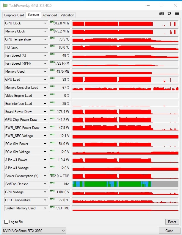 И вот в этом разрешении уже раскрывается потенциал RTX 3060. По температурам и скорости работы вентиляторов сильных отличий не было: 73C' и 1700 об/мин. Потребление видеокарты в обоих разрешениях составило ~165-170W.