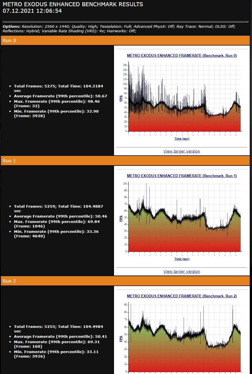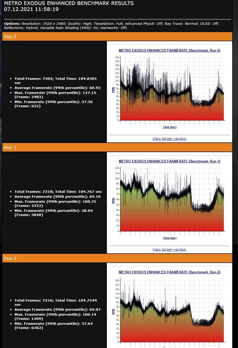 Metro как и Cyberpunk2077 не сильно отличилась какими-либо изменениями в плане температур и скорости вращения, не смотря на то, что обладает более тяжёлым нравом. По чипу снижение температуры составило 5C', скорость работы вентиляторов была зафиксирована на отметке 1589 об/мин. Шум при этом оставался на комфортном уровне. Что немаловажно, уровень потребления карты снизился примерно на 20Вт.