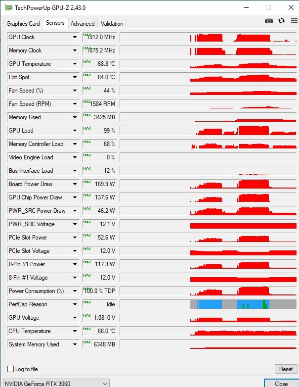 Раз игра не требовательная к ресурсам, соответственно, и RTX 3060 сильно не напрягалась, что видно по температурам чипа: 68C' при 1584 об/мин. Шум при этом оставался на среднем уровне.
