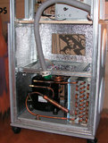 К новому корпусу, назову его Ворчун (чем-то похож на меня), сделал боковые стенки отсека фреонового охлаждения и вырезал два стекла, на фронт. Стекла обычные, но толщиной 5мм. Боковые стенки покрасил краской цвета металлик. Материал 12мм фанера. Изнутри оклеил пенофолом толщиной 5мм. Фольгой внутрь. Так симпатичнее. В стенку, к которой примыкают конденсоры, врезал две решетки. Решетки круглые, немного напоминают иллюминаторы. Пока оставил белыми. Когда окончательно решу с отделкой, покрашу в цвет. Или еще как. Там видно будет. В задней стенке пока только отверстия. Их наверно просто прикрою звукопоглощающими экранами. Это будет панель, оклеенная синтепоном и расположенная на расстоянии 4-5 см от отверстия. Размер экрана будет немного больше размера отверстия. Переделал диффузор процессорной фреонки. Сделал его из пластика и прикрепил к конденсору через прокладки из 10мм пенофола.