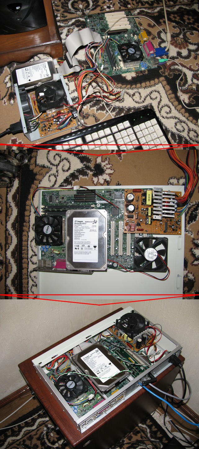 С появление анлима (к сожалению только 256кб) мой комп начал все чаще работать 24/7. И так он проработал год с лишним. Но в один прекрасный момент я вспомнил, как у меня когдато полетел винт, и как я долго восстанавливал инфу с него. А щас у меня в компе 3 винта и все почти забитые по завязку. Тогда нарыл старенький "Пентиум 3", и решил сделать с него торрент качалку. И хотелось мне сделать его чем по компактней <img src="http://cp.people.overclockers.ru/smiles/icon_rolleyes.gif" border="0">