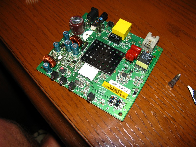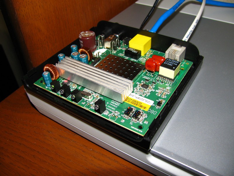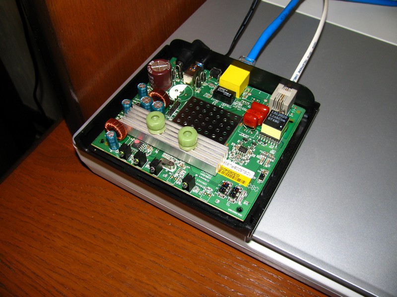 Как-то закончилась гарантия на мой АДСЛ роутер. И тут мне вспомнилось, как он сильно грелся первый месяц работы 24/7. Ну что делать?)) ,нужно смотреть во внутрь что ж там его так грело. Снял две резиновые ножки и открутил два винтика под ними. Легкий щелчок защелок корпуса и вот что перед нами: