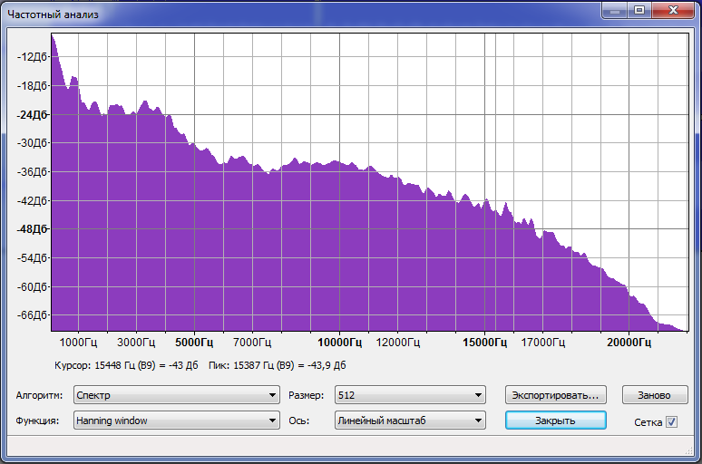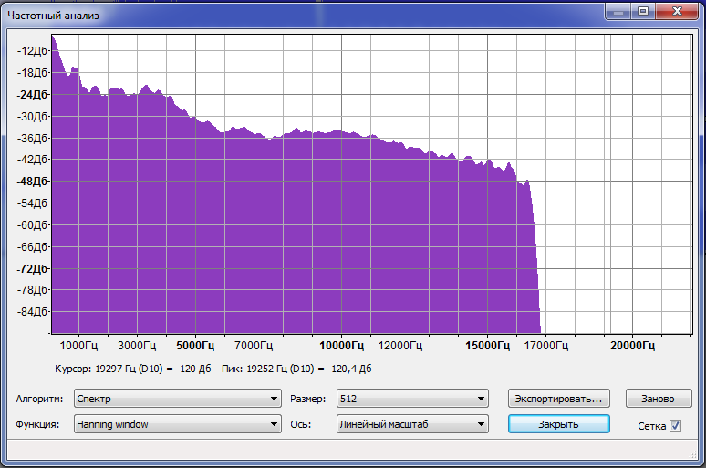 Сразу бросается в глаза резкая обрезка после 17 кГц. Этим и объясняется худшее звучание по сравнению с оригиналом.