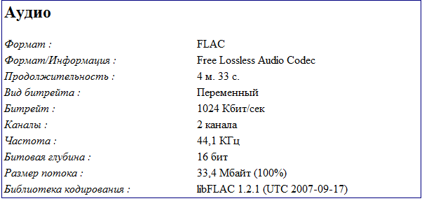 В качестве исходного материала был скачан первый попавшийся альбом в формате FLAC со следующими техническими спецификациями: