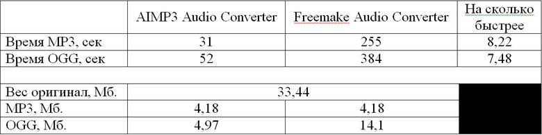 Качество звучания файлов в формате OGG, для меня, уже неотличимо от оригинала. AIMP3 Audio Converter оказывается в 8 раз быстрее и позволяет кодировать с меньшим битрейтом и получать файлы в 3 раза меньшего веса.
