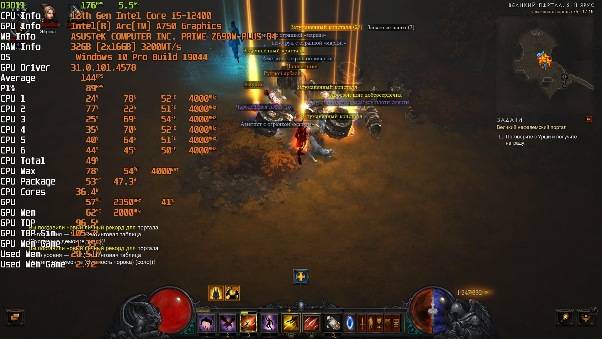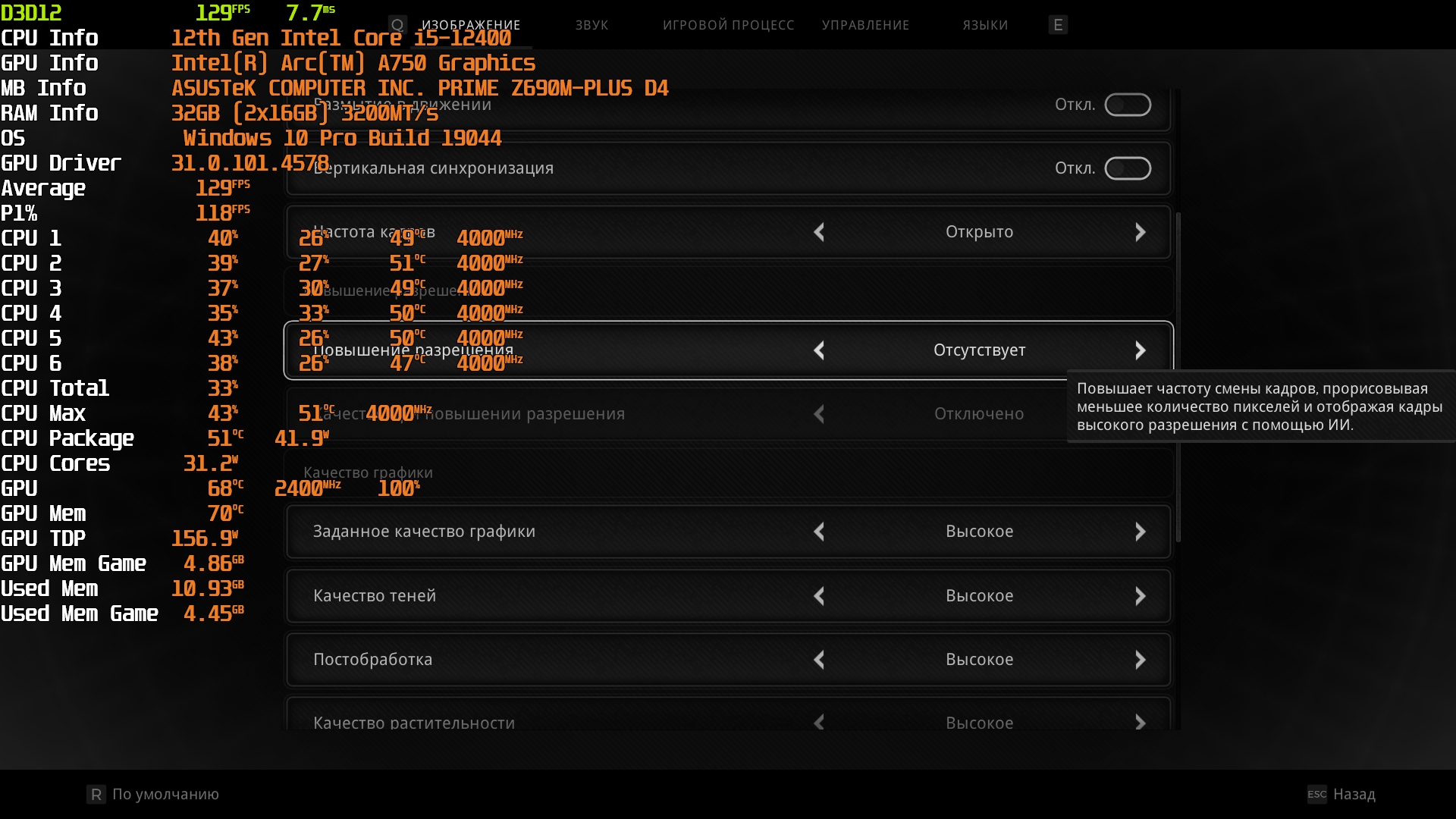 Технология Intel XeSS и разгон не использовались - если без использования данных "опций" видеокарта покажет хорошие результаты, то и смысл в их использовании теряется.