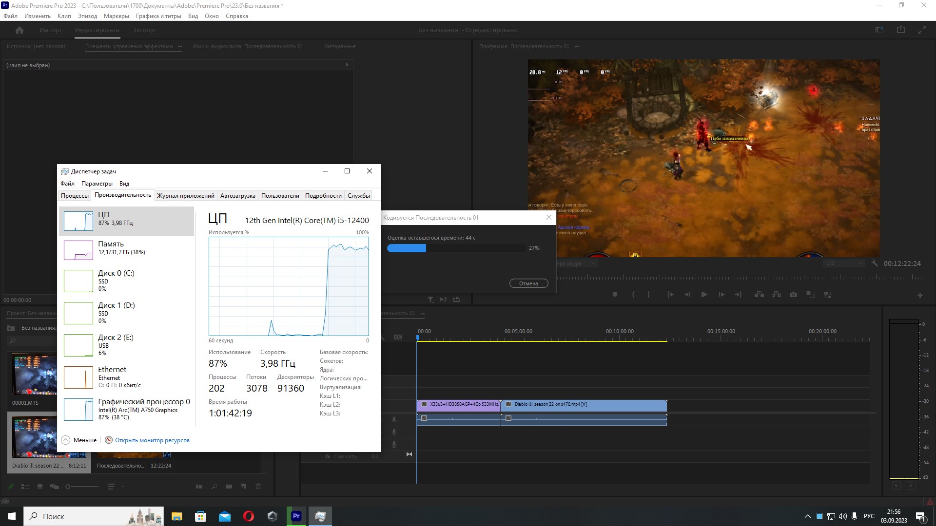 Рендер двух роликов (720р/30фпс) в один 13-минутный с апскейлом до 1080р/30фпс и сохранением Высокого качества при использовании кодека HEVC(H265) занял не более 65сек. Основная нагрузка большую часть рендера лежала на видеокарте. Средняя загрузка видеокарты во время рендера - 80-93%, процессора - 20-32%.