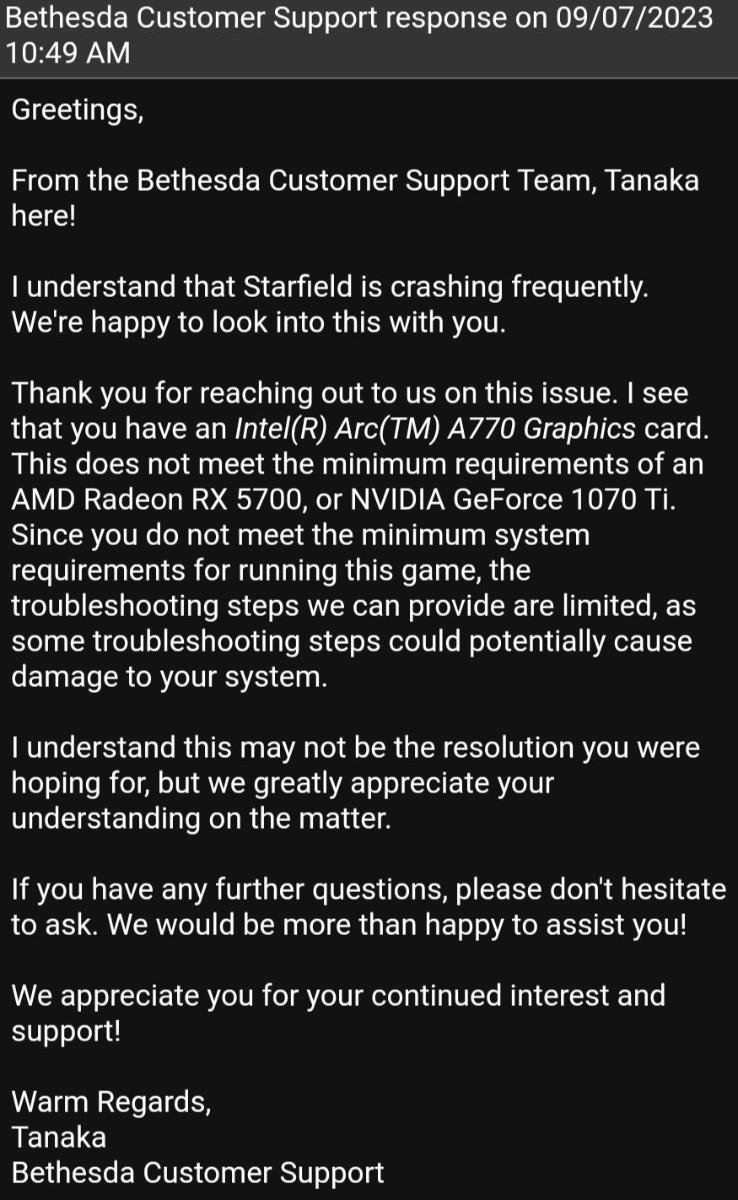 Как вы переведете данный ответ Техподдержки Бетезды на вопрос - "Будет ли в Звездополье поддержка видеокарт Интел АРК?" - зависит от вашего чувства юмора.