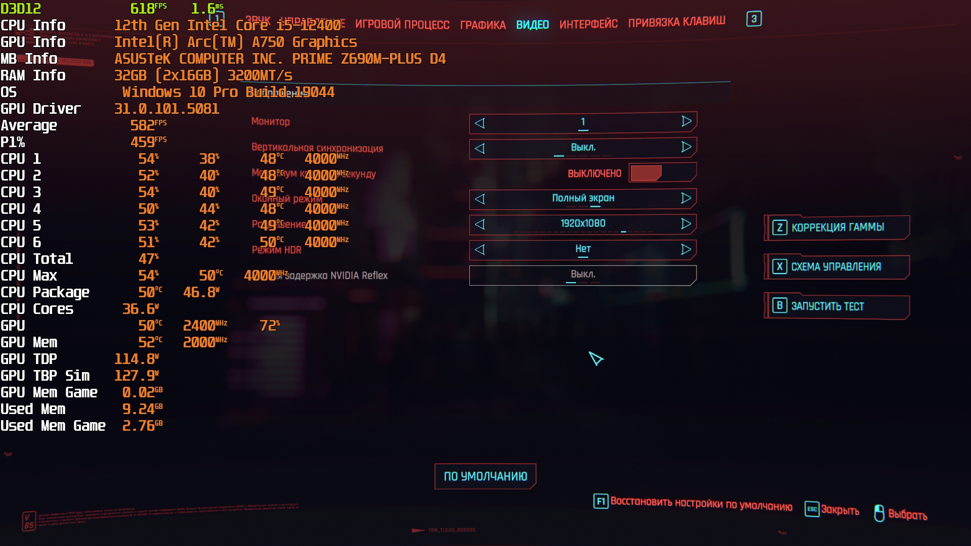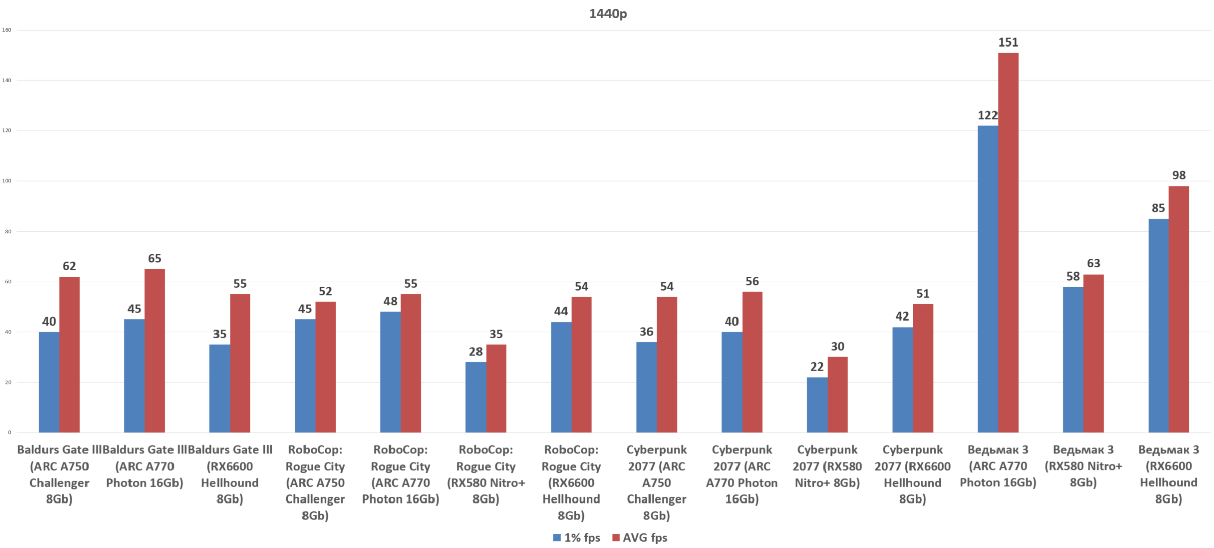 В разрешении 1440р чуда не произошло, соотношение сил осталось почти прежним. "Почему нет результатов Алены с Вяком 2" ? На самом деле все просто - при тестировании в 1440р РХ6600 показала неприлично низкий, точнее консольный результат + управление было... ватным. На видеокартах Интел фпс был в районе 38-45, что тоже не назовешь "блестящим", правда без ватности в управлении. В Робокопе также начинает ощущаться ватность, при падении фпс ниже 45. А вот при переходе в 1440р в Киберпанке 2077 расклад сил сместился в сторону карт Интел.