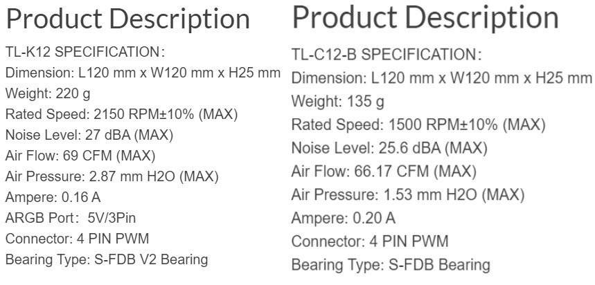 Данная модель является модификацией TL-B12, от которой ее отличает только наличие подсветки напротив точек крепления. Уровень шума на максимальных оборотах составляет 49.5дБА. Чуть ниже приведен скрин характеристик TL-K12 и TL-C12-B, чтобы легче было понимать графики в Результатах тестирования.