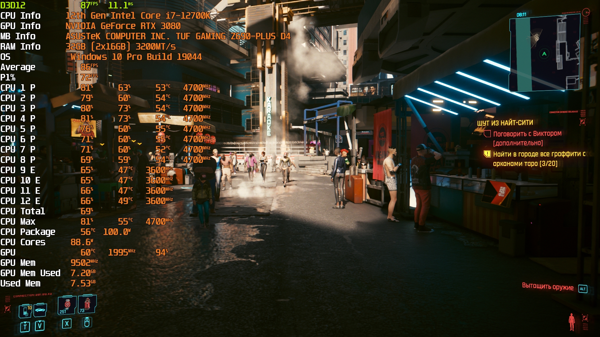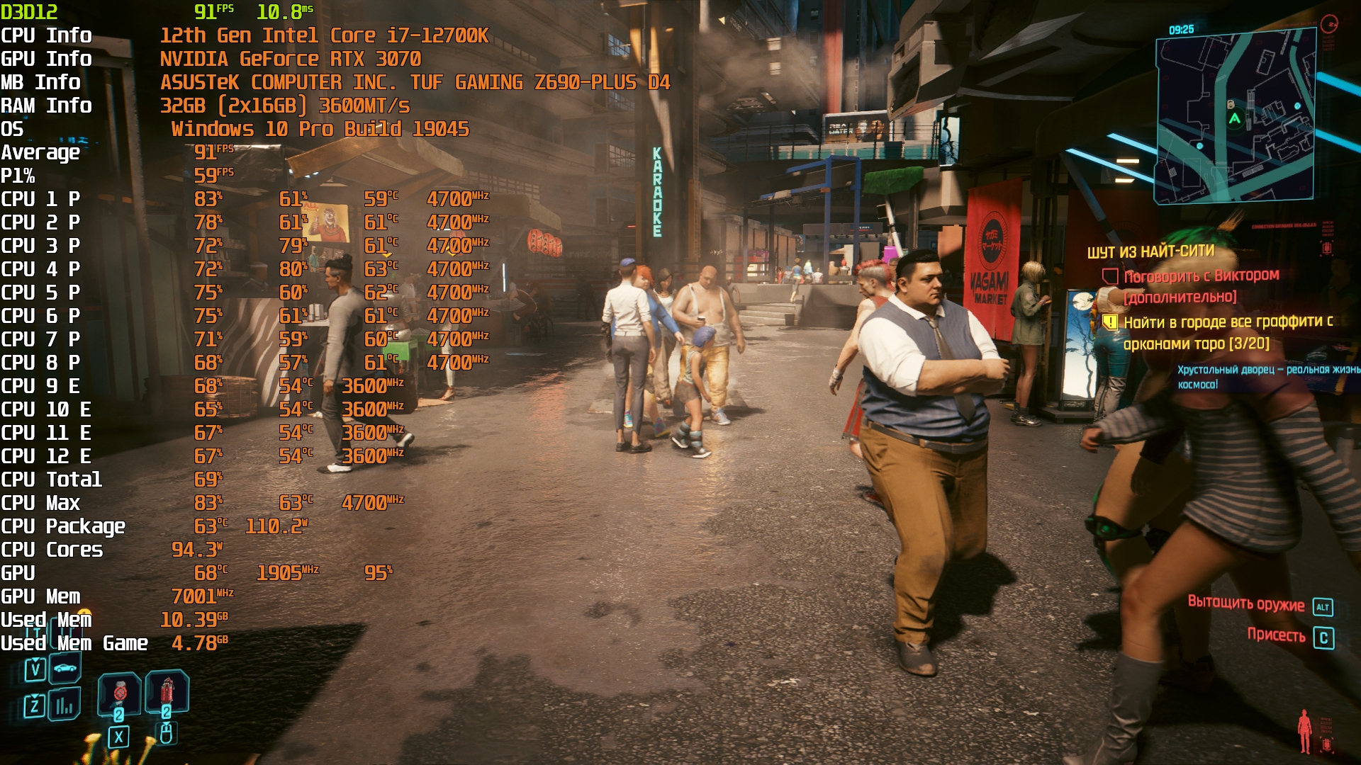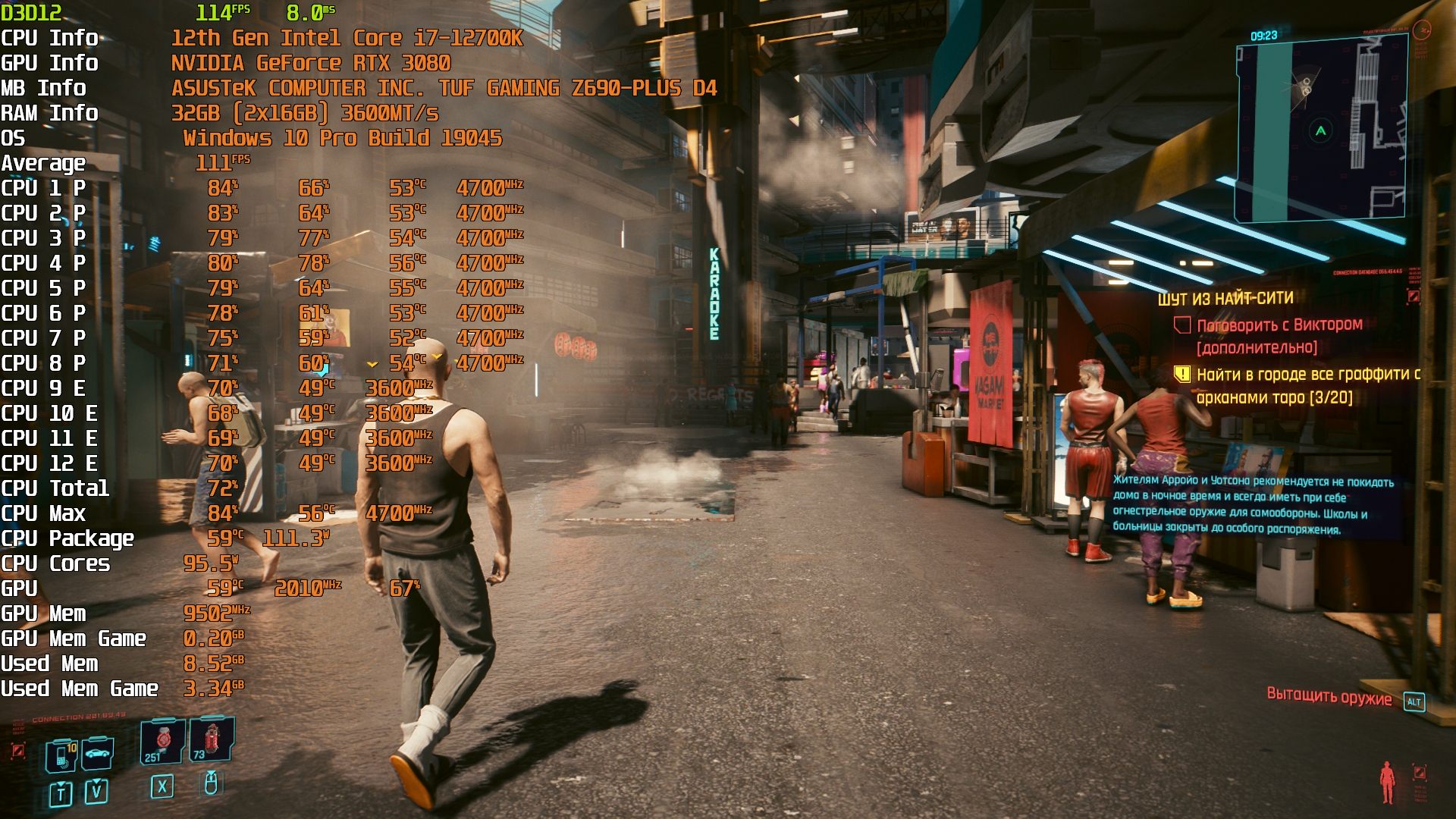 Cyberpunk 2077(GOG) v1.63 - Маленький Китай, 1080р/Высокие (на 900 об/мин). Плотность толпы - Высокая. Без трассировки лучей.