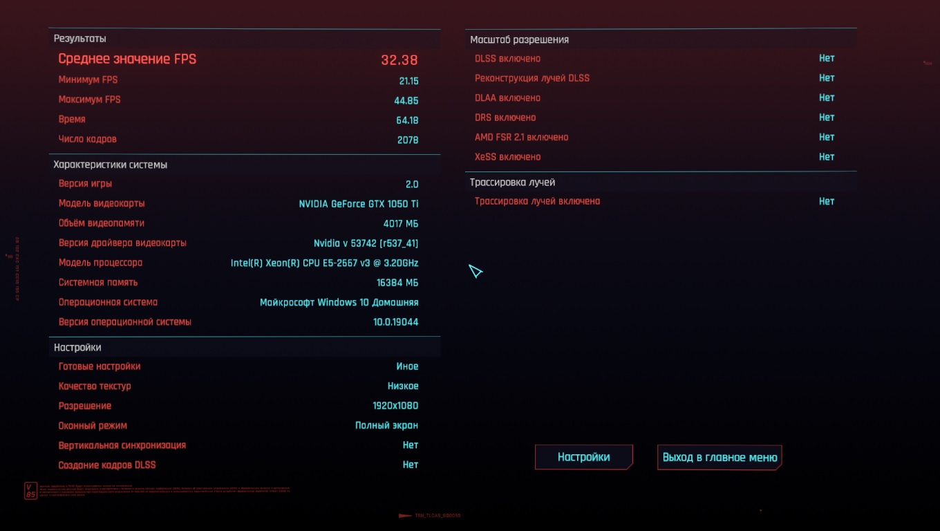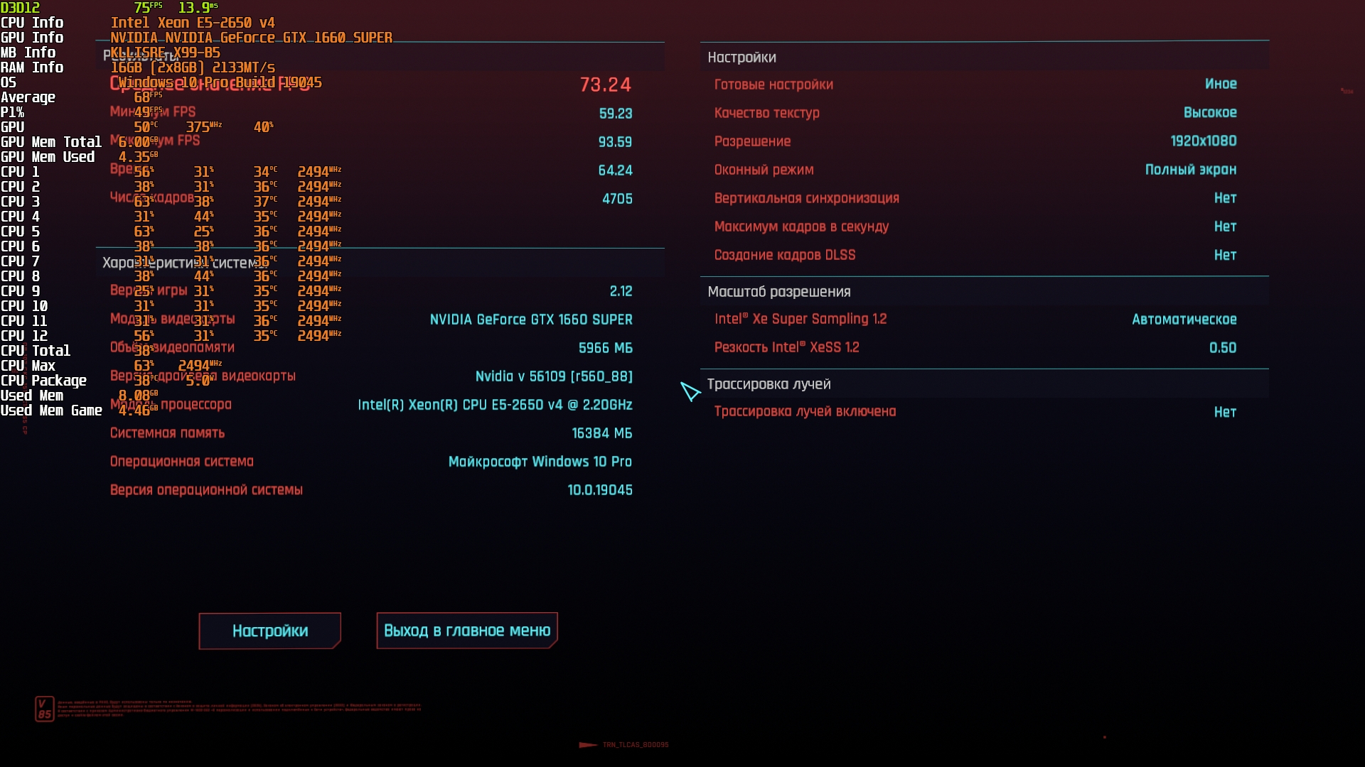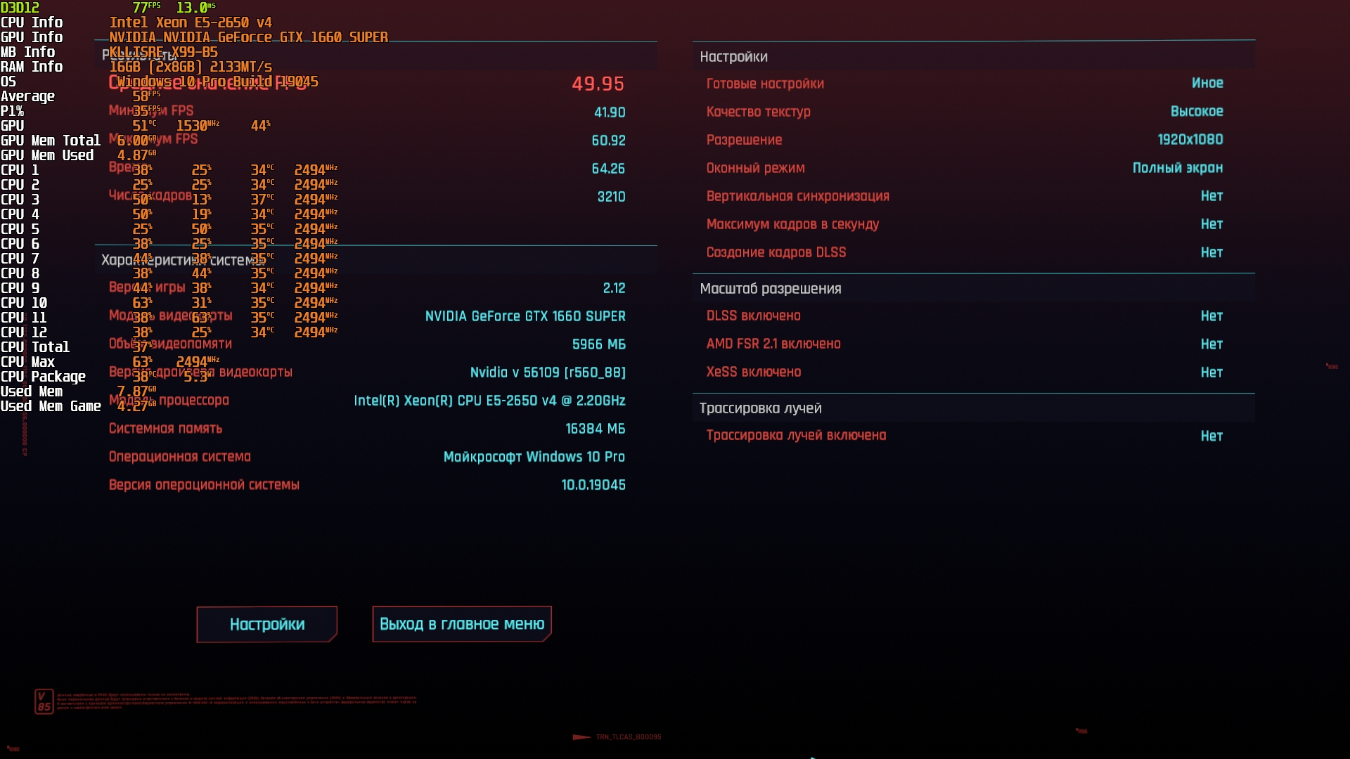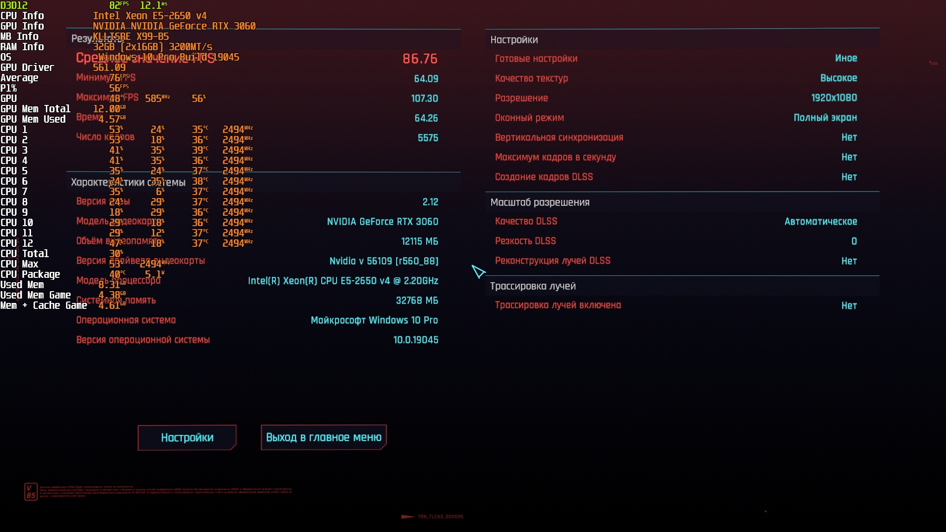 - Cyberpunk 2077 v2.12 (GOG) : 1080р/Высокие с DLSS и без