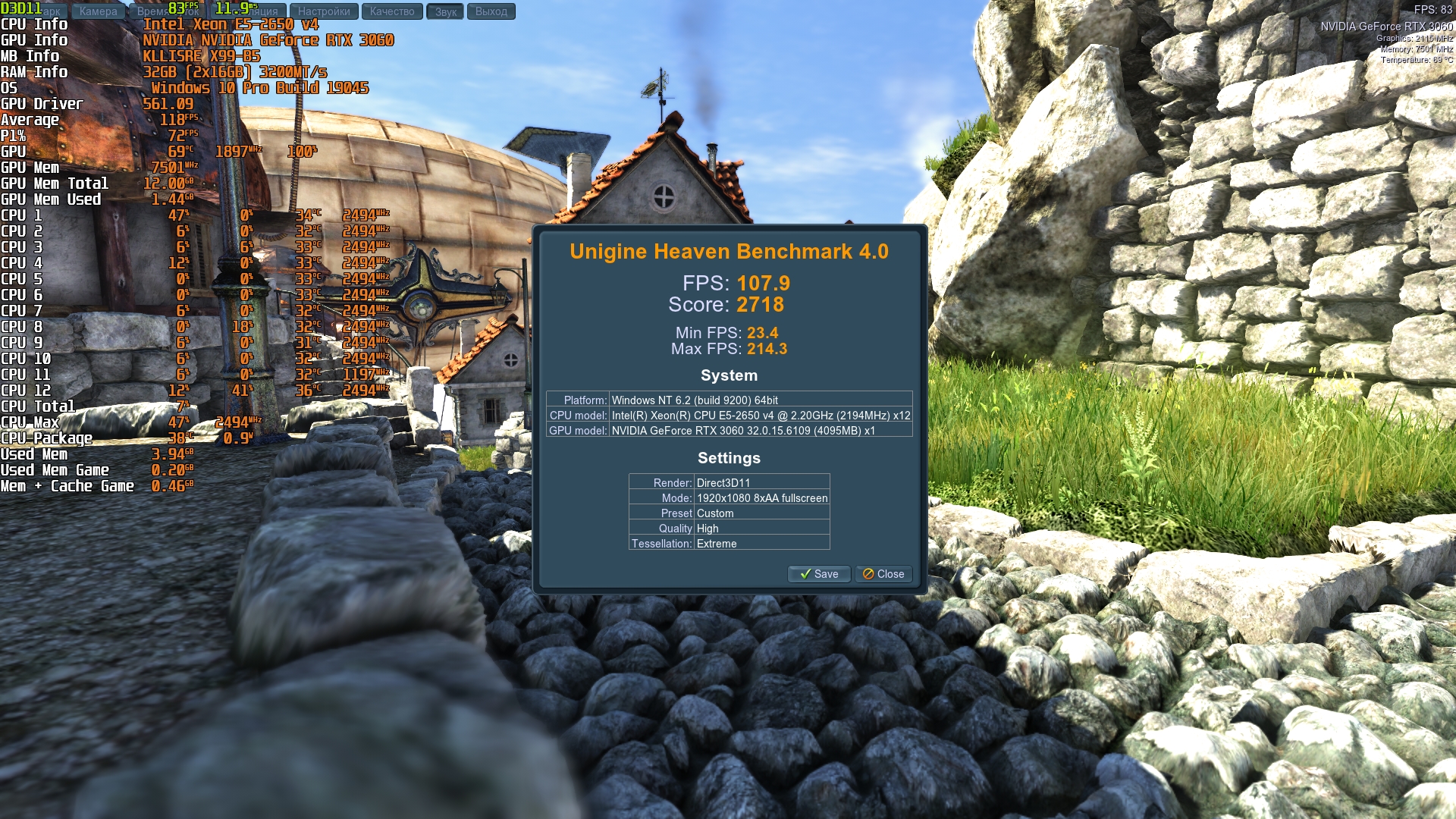 - Unigine Heaven : 1080р/Высокие, Тесселяция - Экстрем