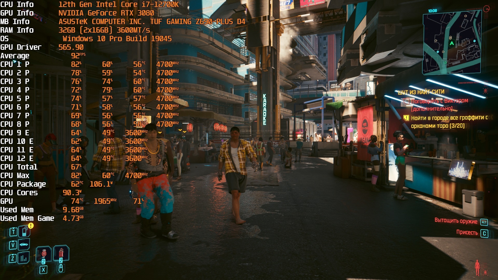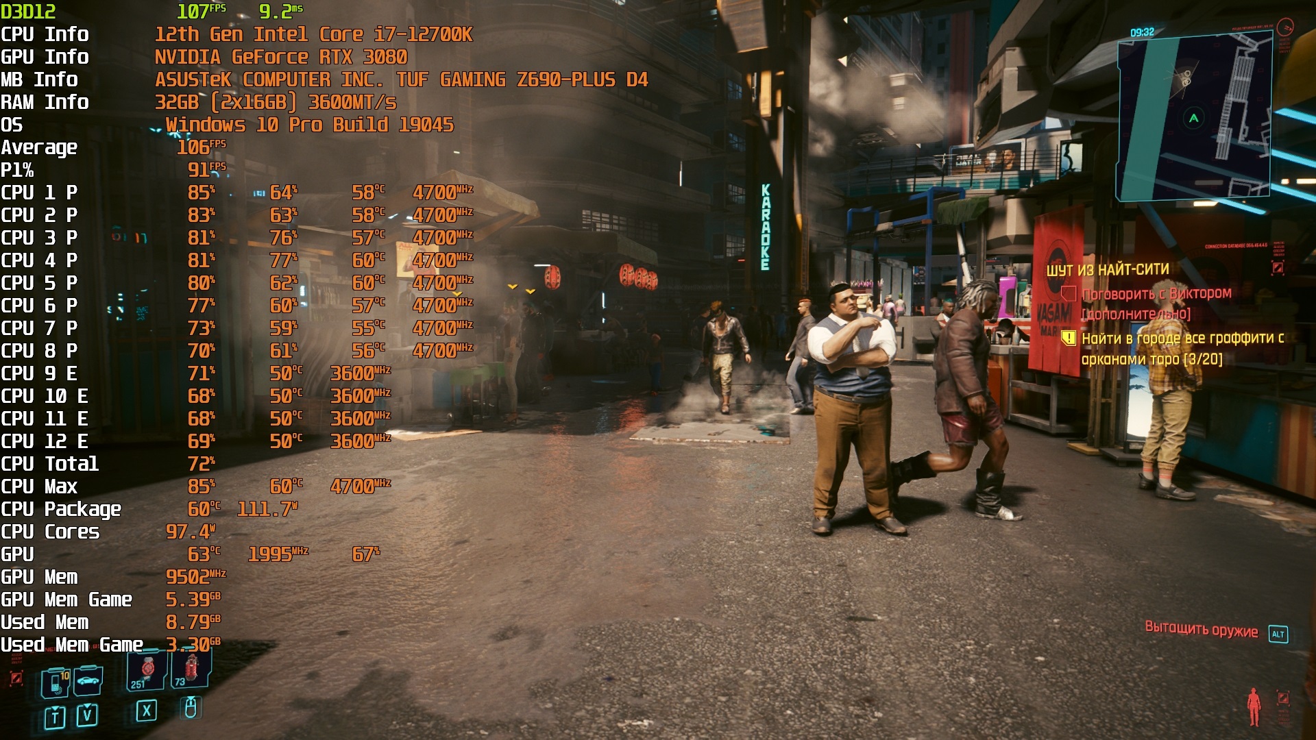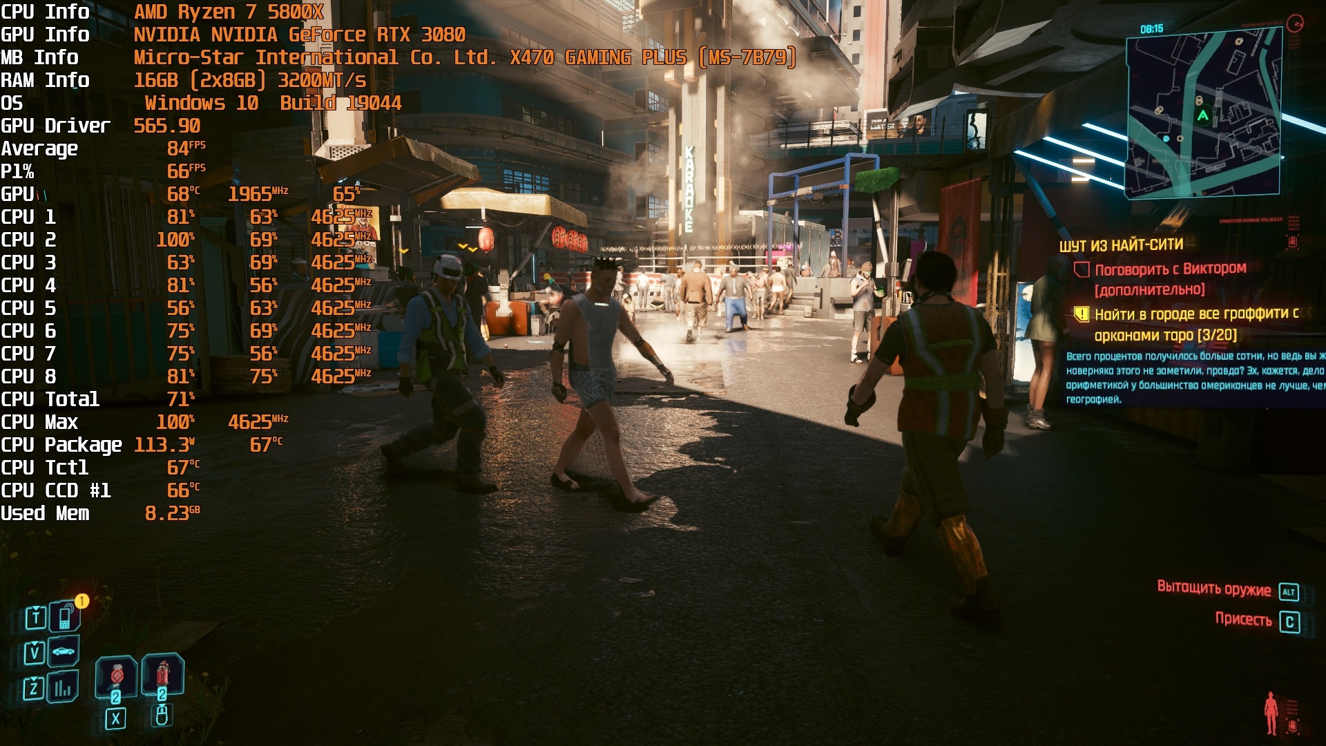 Cyberpunk 2077(GOG) v2.12 - Маленький Китай, 1080р/Высокие (на 900 об/мин). Плотность толпы - Высокая. Без трассировки лучей.
