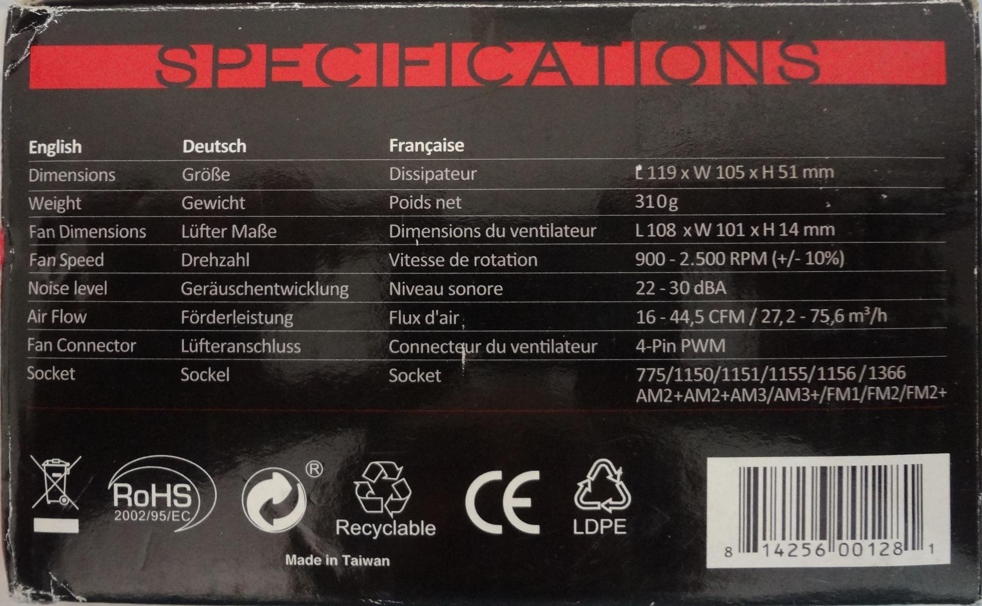 На боковых сторонах представлены спецификации кулера и его особенности.