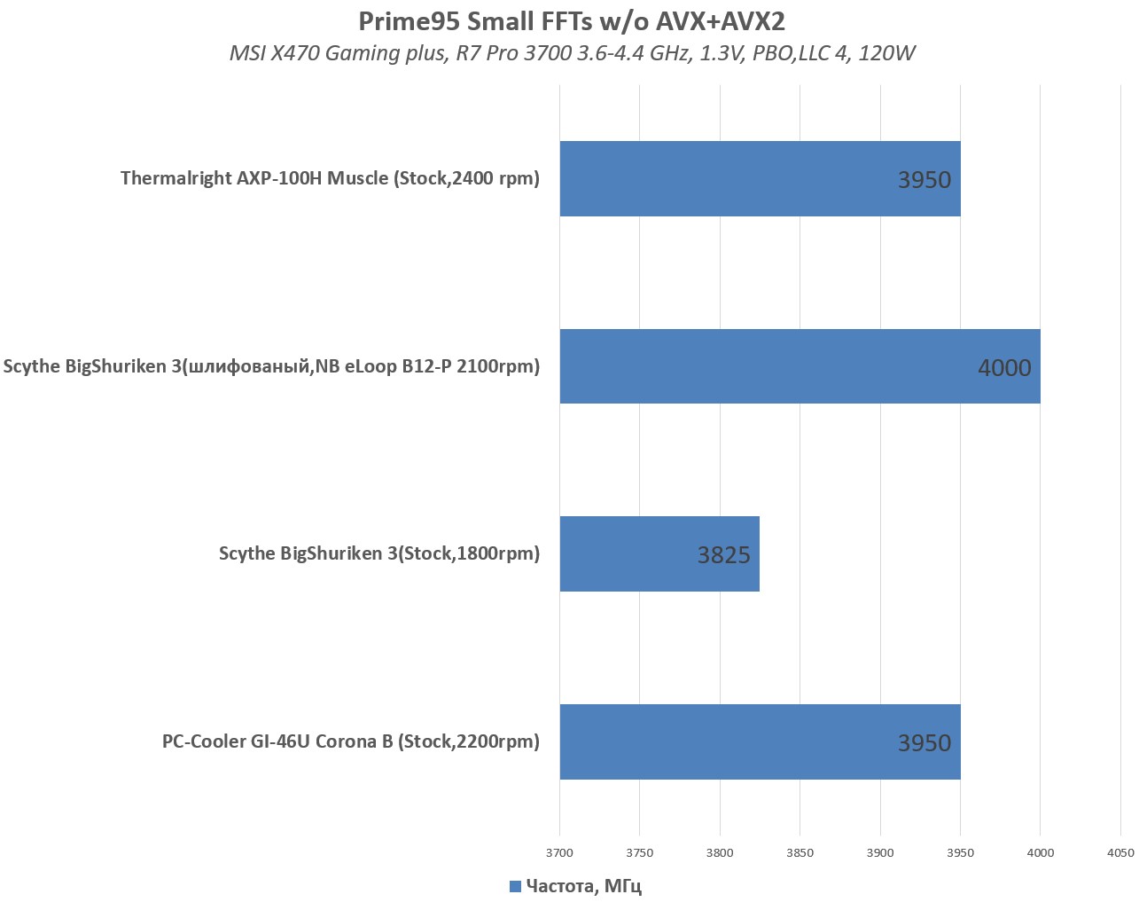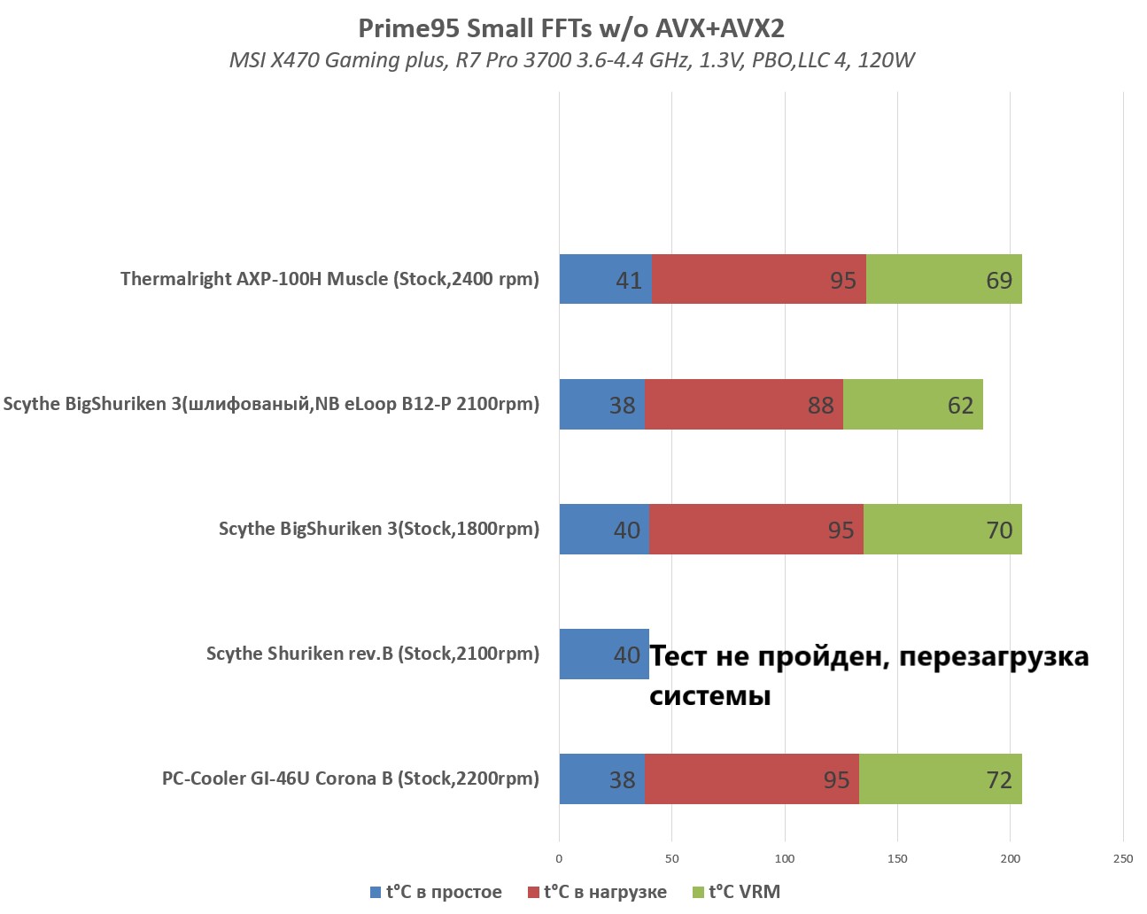Прайм95 с нагрузкой в 120Вт удачно смог пройти только Большой Сюрикен 3. И только после проведения грубой шлифовки основания. Остальные участники в той или иной мере с тестом не справились. Реальная нагрузка, которую может потянуть большинство top-flow кулеров - не более 110Вт, даже если на коробке указано 125-130Вт. Это с учетом особенностей Зен2.