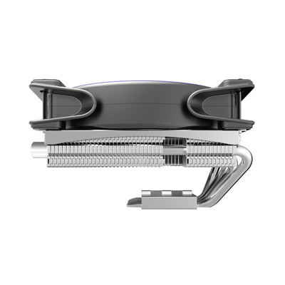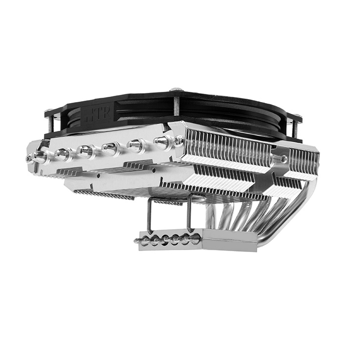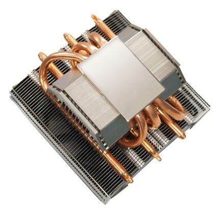Кулер имеет тонкий - всего-лишь 19мм толщиной радиатор, набранный 49-тью алюминиевыми ребрами на 4-х 6мм никелированных теплотрубках. Для увеличения рабочей поверхности радиатора на пластинах имеется "оптимизация" - выштамповка "пупырышками". С обеих сторон радиатор снабжен замками в 3-х местах - это увеличивает жесткость радиатора, но и повышает требования к вентилятору.