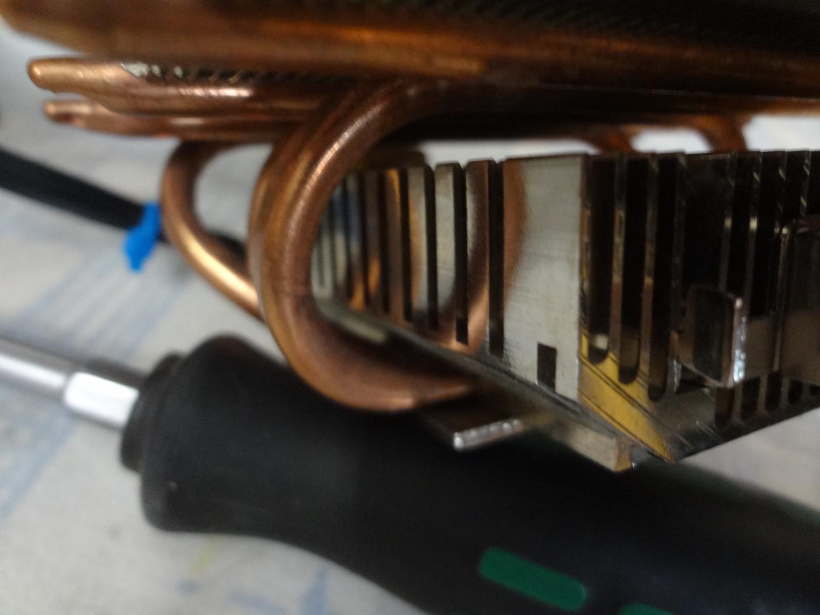 Толщина основного радиатора небольшая - всего 15мм, но под ним, сверху на трех теплотрубках, припаян весьма массивный вспомогательный алюминиевый радиатор.