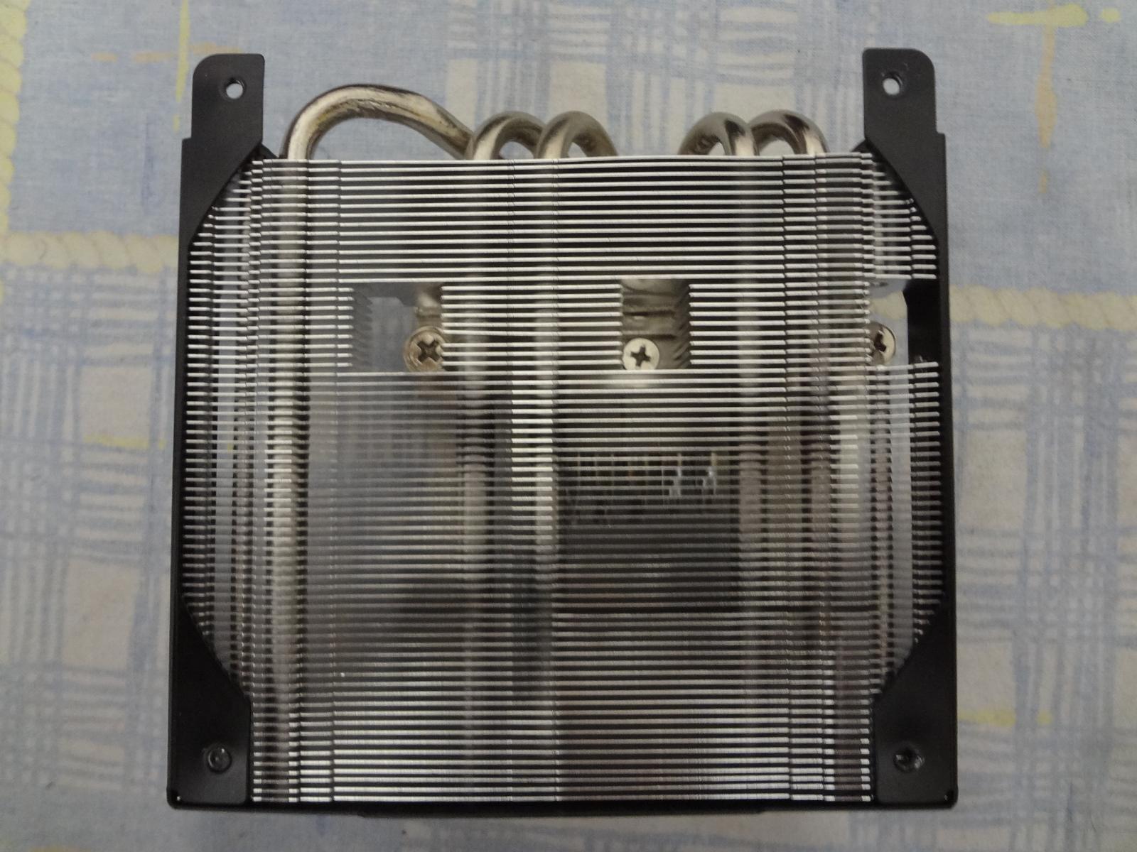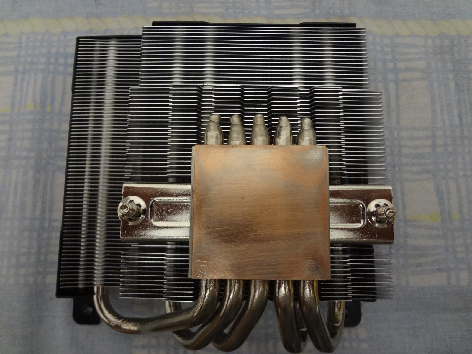 Основание у кулера плоское. Теплотрубки в основании пропаяны по всей длине без зазоров. Радиатор имеет 5 укороченных ребер - таким образом производитель решил организовать технологические отверстия, для закручивания крепежа кулера.