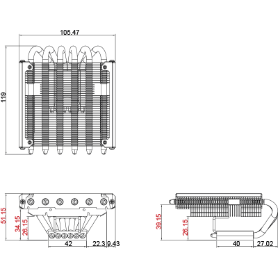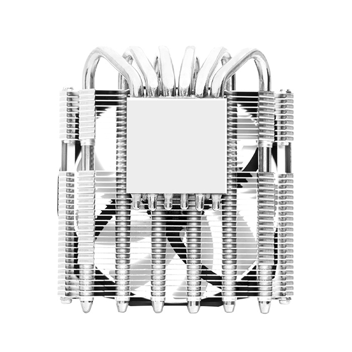 Радиатор из 39 алюминиевых пластин с межреберным расстоянием 2.0мм набран на 6-ти 6мм никелированных теплотрубках. Ребра на теплотрубках просто обжаты.