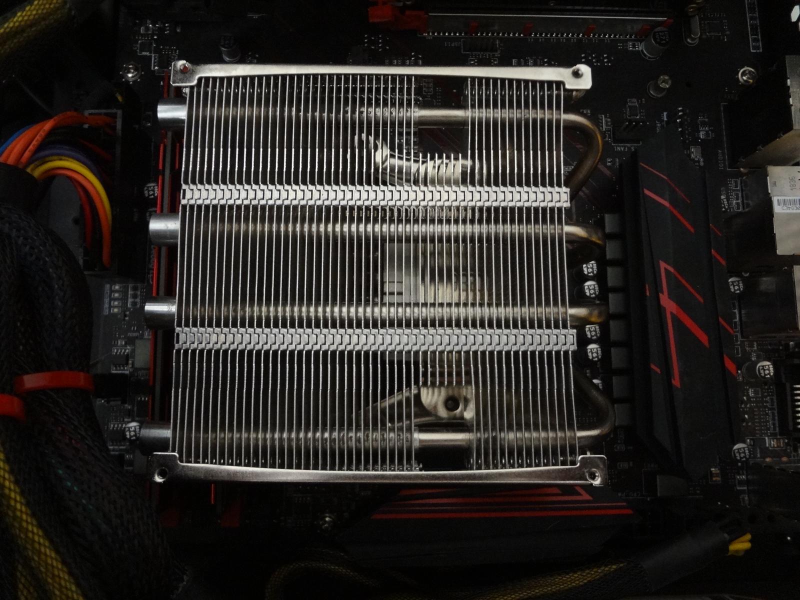 Радиатор набран 68-ю ребрами и имеет 3 уровня - это сделано для лучшей совместимости кулера с радиаторами VRM и ОЗУ. Ребра просто обжаты на 5-ти 6мм, никелированных теплотрубках. Основание пришлось подвергнуть грубой шлифовке, чтобы узнать потенциал кулера.