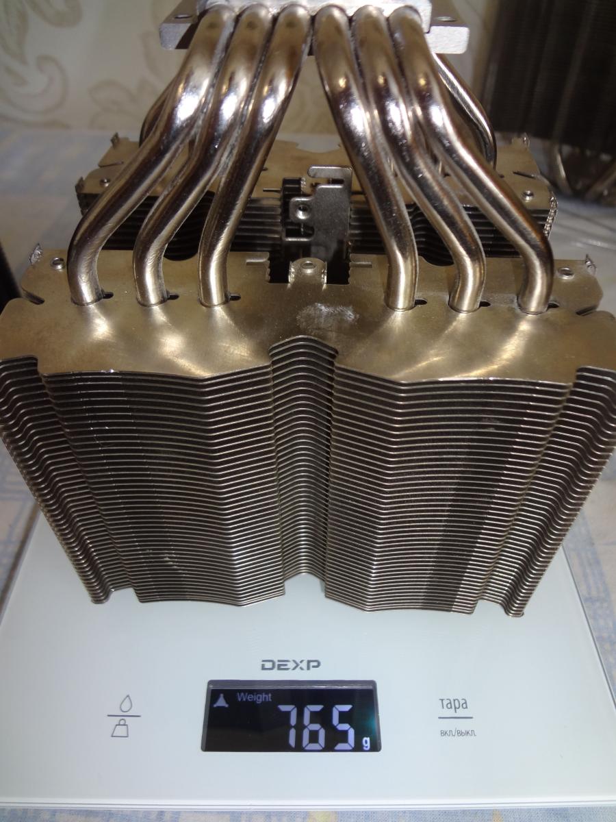 Крепление создает очень сильный прижим, после полного закручивания винтов крепления радиатор невозможно сдвинуть вокруг своей оси ни на миллиметр. Кулер большой, в полной сборке блокирует все 4 слота ОЗУ на стандартной АТХ плате. Поэтому память стоит устанавливать до полной сборки кулера (установки на него вентиляторов).