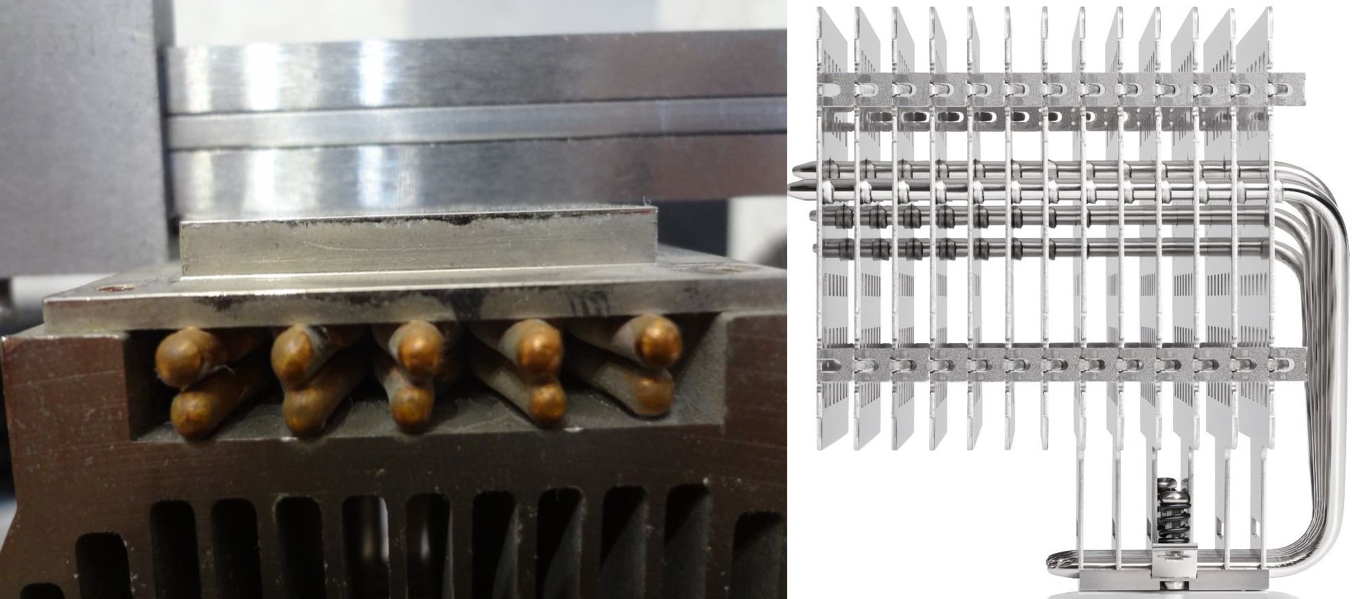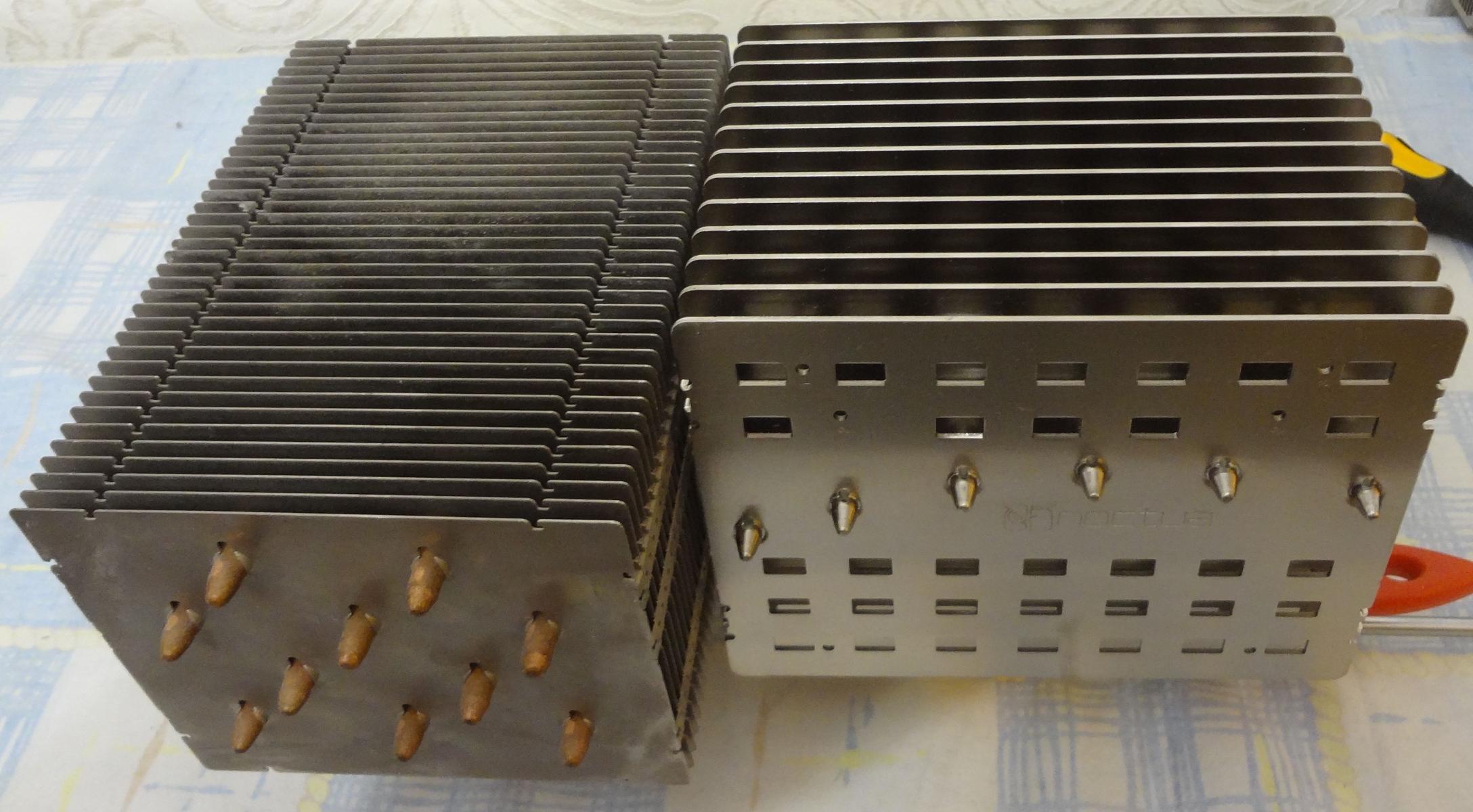Радиатор Ноктуа набран на 6-ти 6мм С-изогнутых никелированных теплотрубках. Орочи - на 10-ти 6мм также С-изогнутых теплотрубках, которые в основании расположены в 2 уровня,при этом еще и приплющены (что увеличивает площадь теплообмена), в самом радиаторе теплотрубки расположены в 4 уровня (для более равномерного распределения тепла).