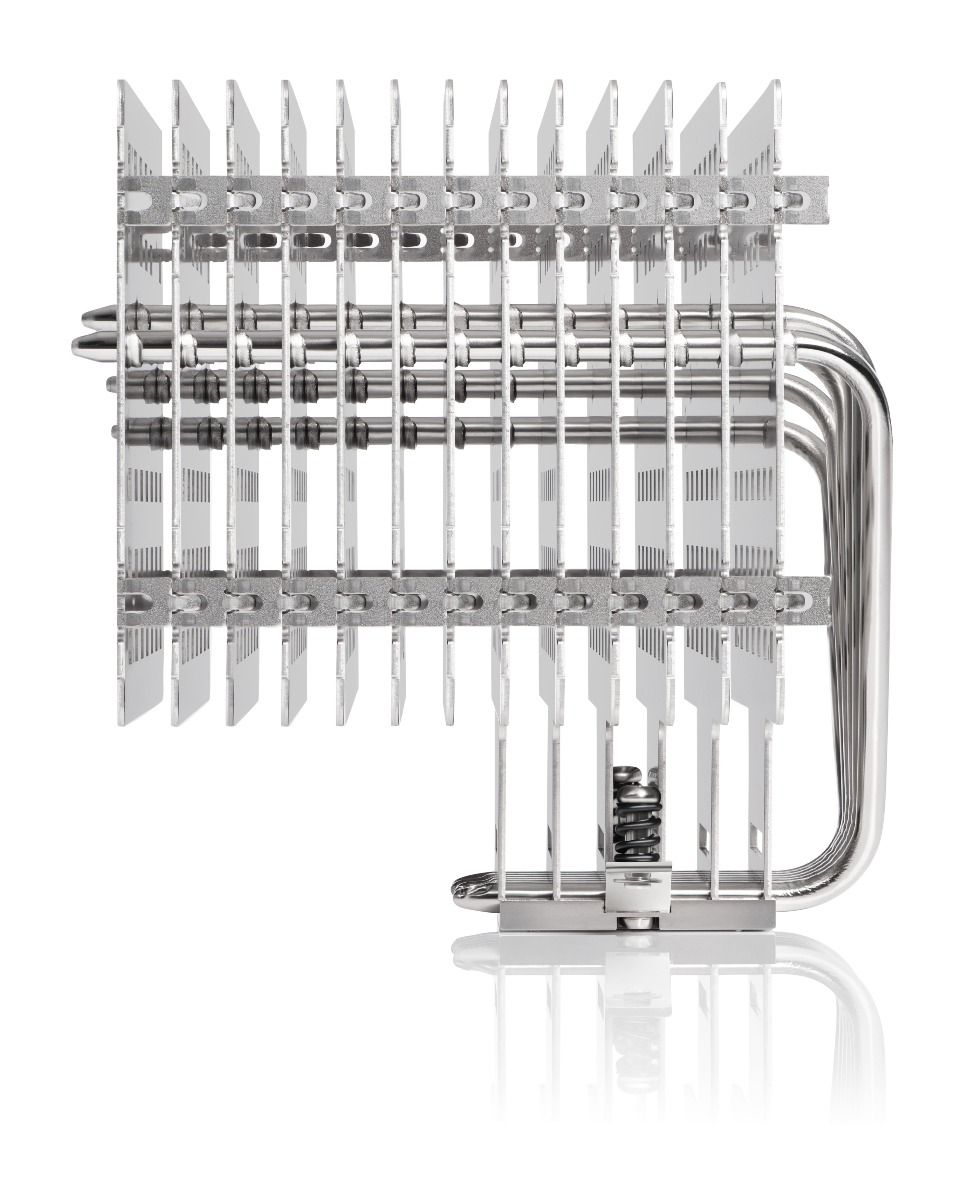 Радиатор Ноктуа выполнен в формате куба. Каждое ребро имеет 33 отверстия для улучшения охлаждения путем конвекции. Как видно из снимка выше, основание у Ноктуа непосредственно контактирует с радиатором, а между ними в специальных желобках, зажаты теплотрубки. Вся эта конструкция - цельнопаяная.