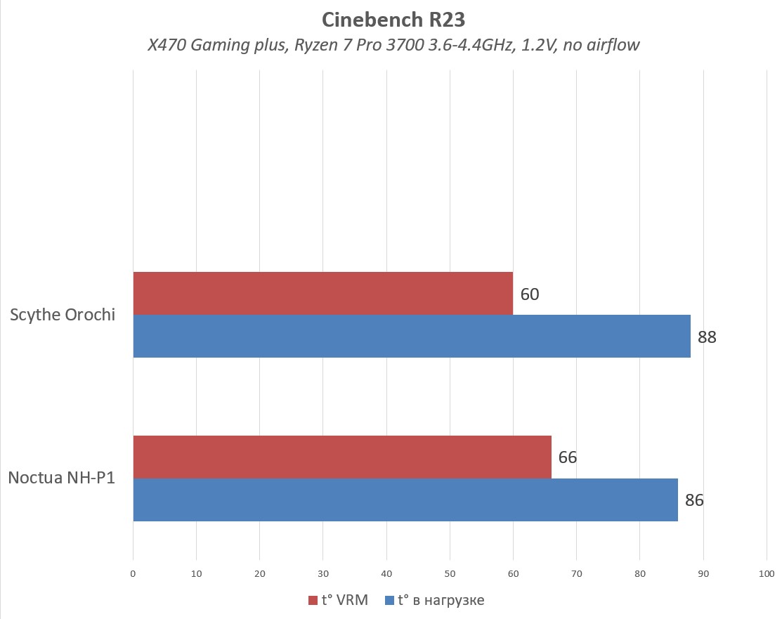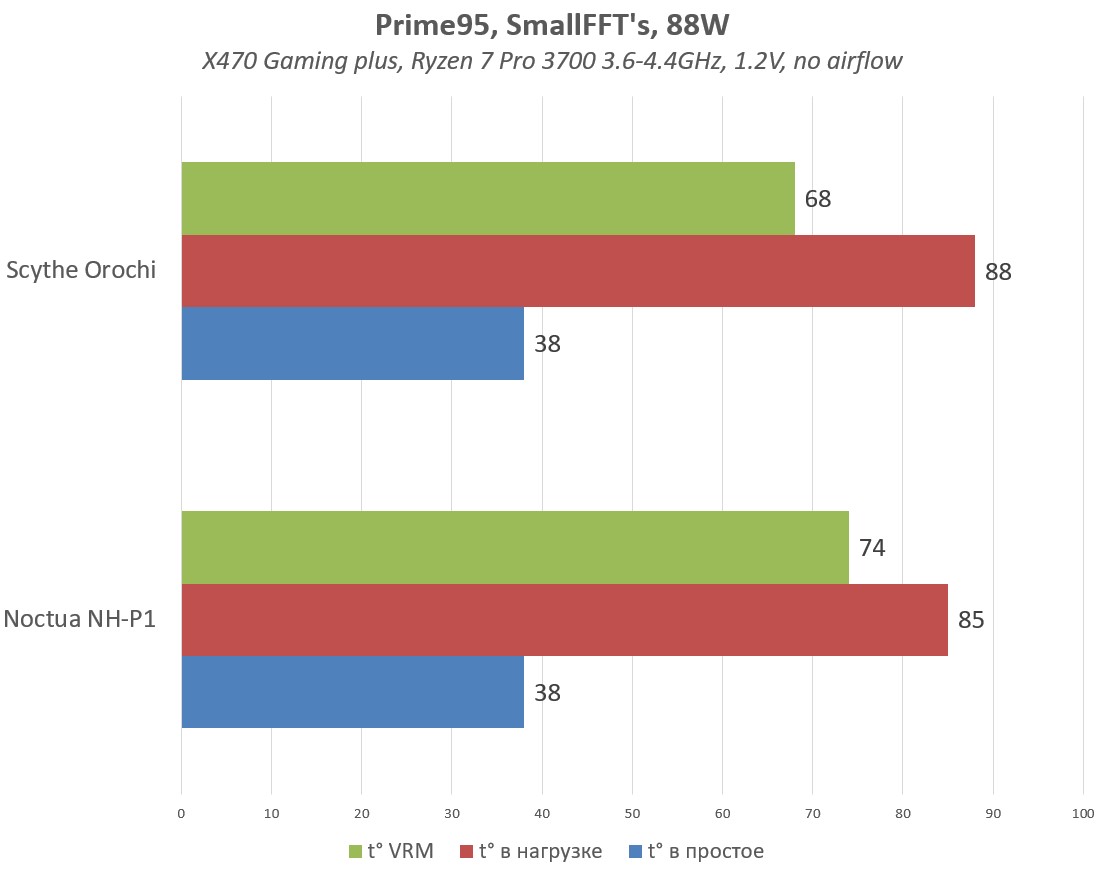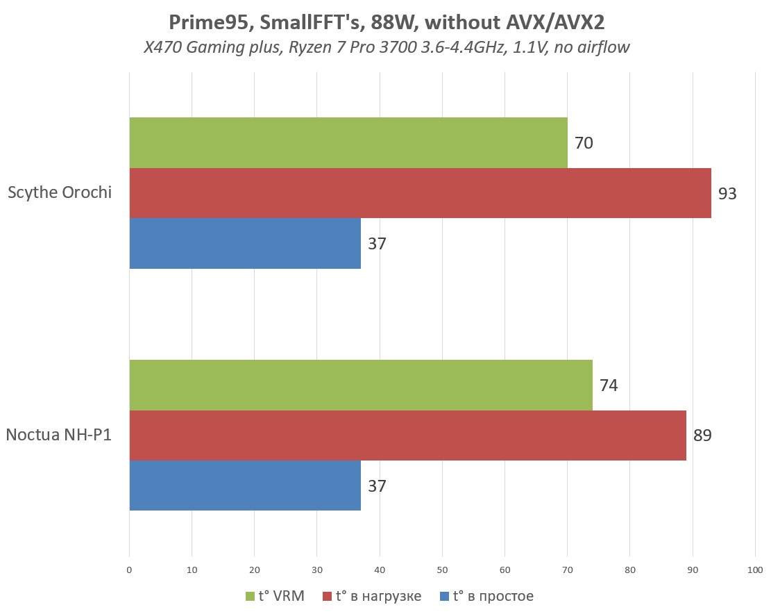 Некоторые читатели назовут меня "неадекватным", но во время тестирования радиатор Ноктуа после стресс-теста Прайм95 остужал до первоначальных значений ЦП и VRM почти 2ч, в то время как его оппоненту на это требовалось 1.5ч. Температуры радиаторных пластин в самой горячей точке ( во время нагрузки) не превышали 46°C у обоих испытуемых - спокойно можно было положить руку и не обжечься. А вот воздух от них исходил раскаленный.