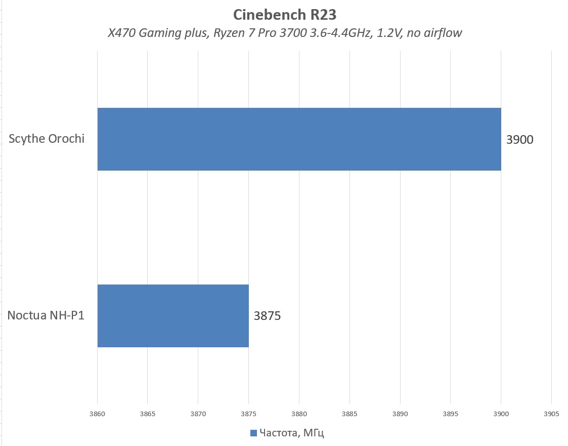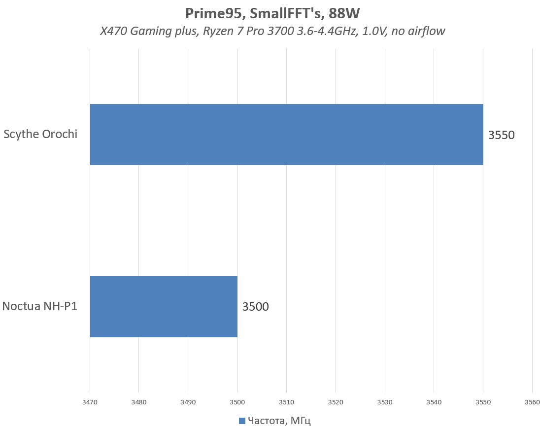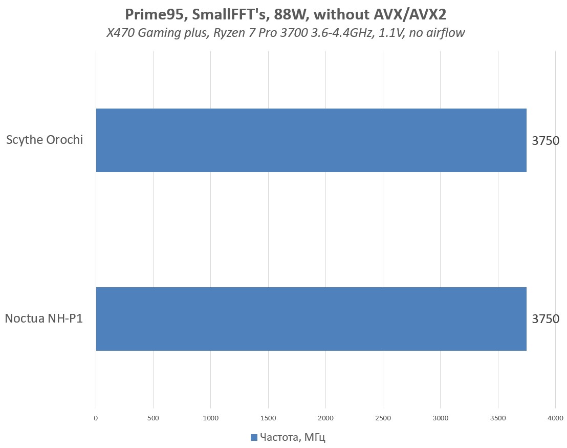 Частота 3.75ГГц для NH-P1 в данном тесте отказалась максимальной с первых же минут, в то время как для Orochi на протяжении почти 40 мин тестирования максимальной частотой была 3.85-3.9ГГц. "Метки времени" не проходят даром.