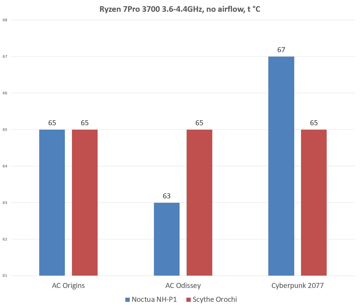 Cinebench R23 (имитация рендера, нагрузка - 88Вт) - тестирование делалось: в три 10-минутных прогона. Во время прохождения тестирования обдув отсутствовал.