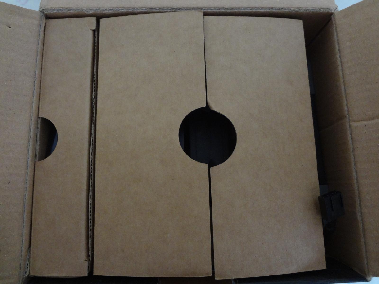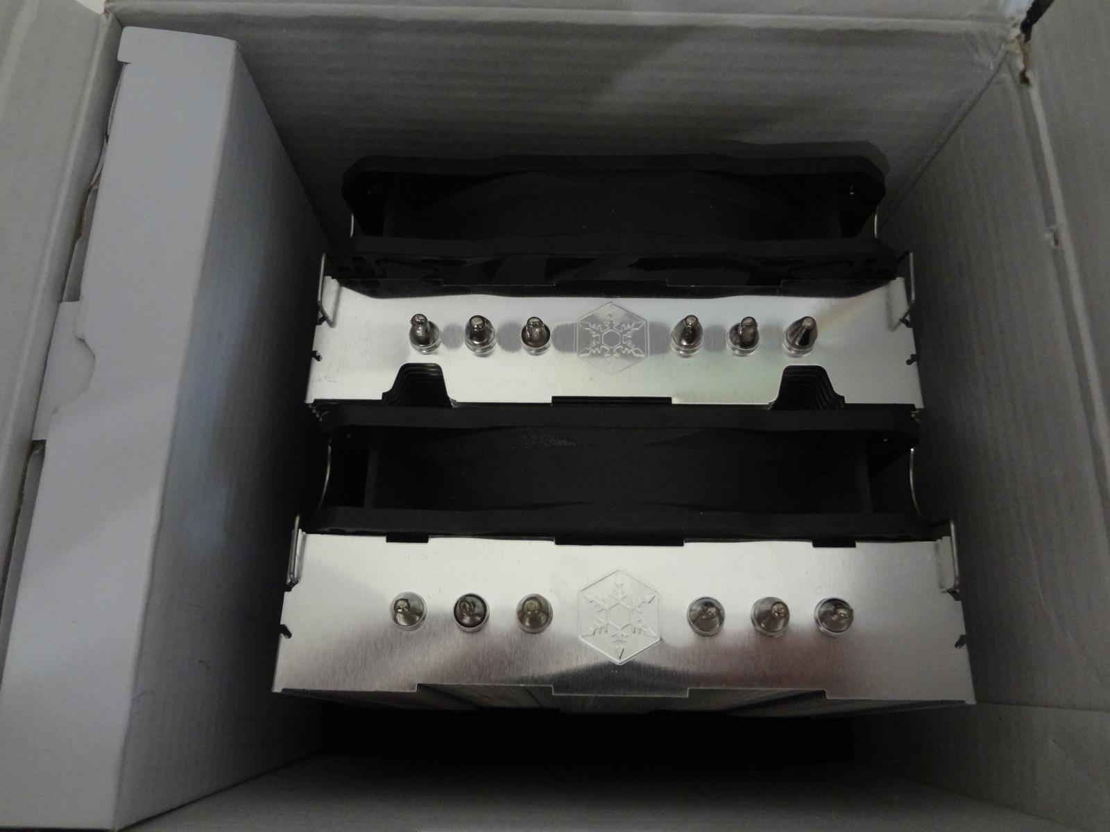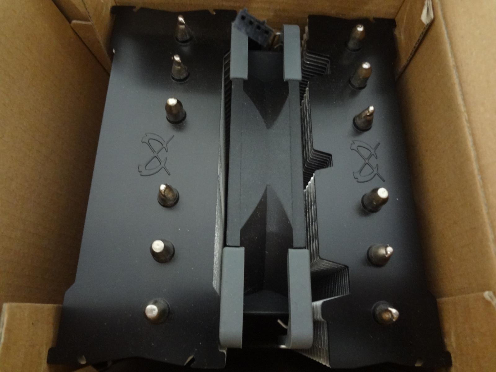 Внутри большой коробки кулер и аксессуары упакованы в контейнеры из гофрокартона. Передний слимовый вентилятор просто стоит на подставке м/у коробкой с кулером и стенкой основной тары.