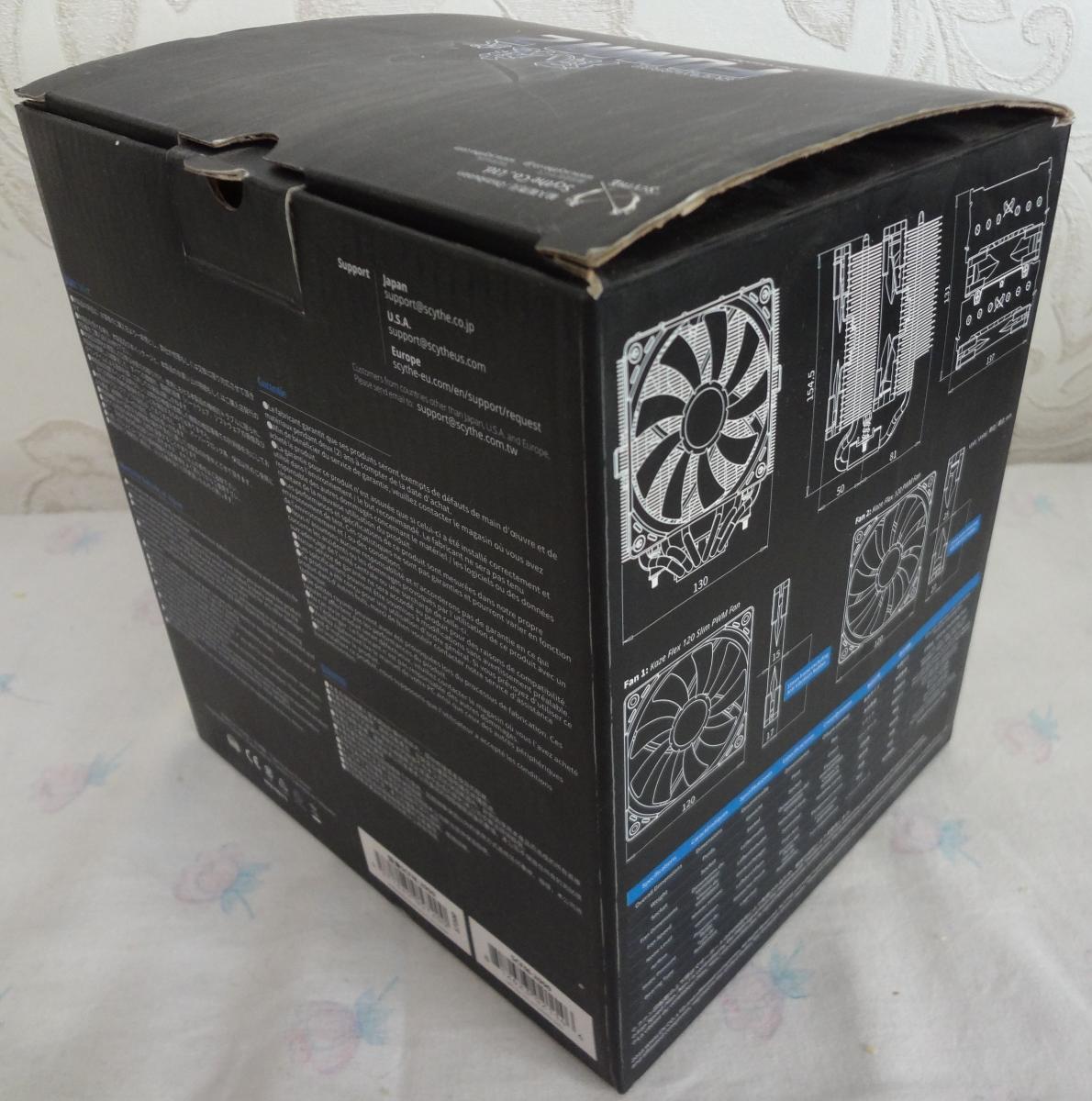 Кулер упакован в строгую, черную коробку из гофрокартона с цветной полиграфией. На передней стенке - цветное 3D-изображение кулера, название кулера и модель комплектных вентиляторов. На боковые стенки нанесены изображение и информация об особенностях продукта. На задней стенке - гарантийные обязательства.