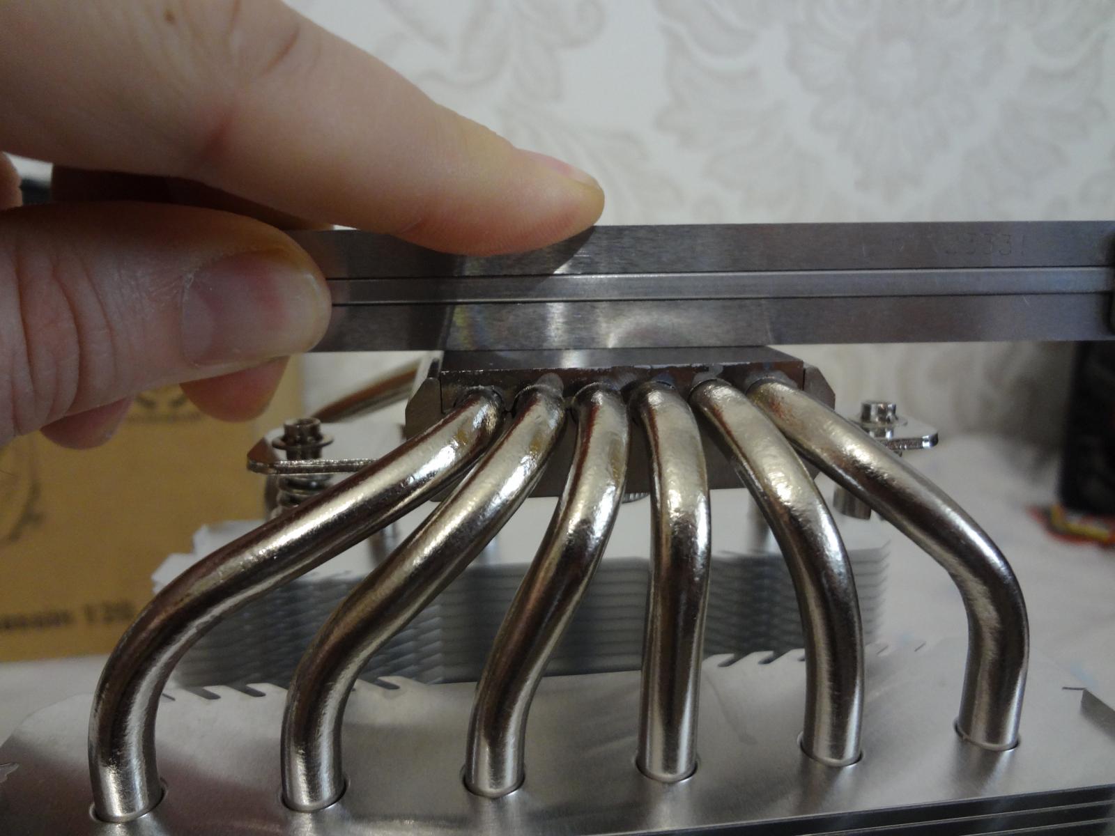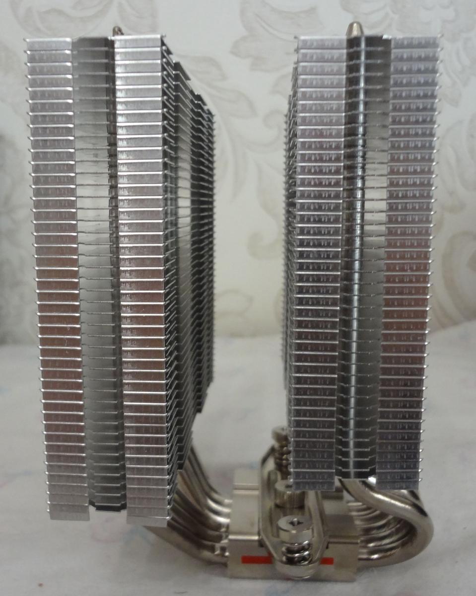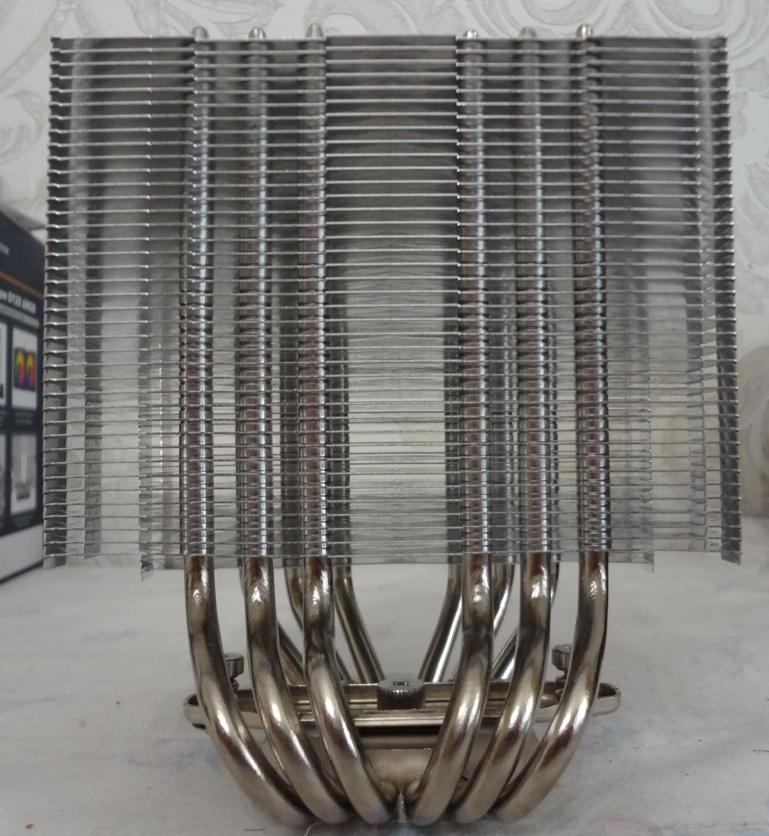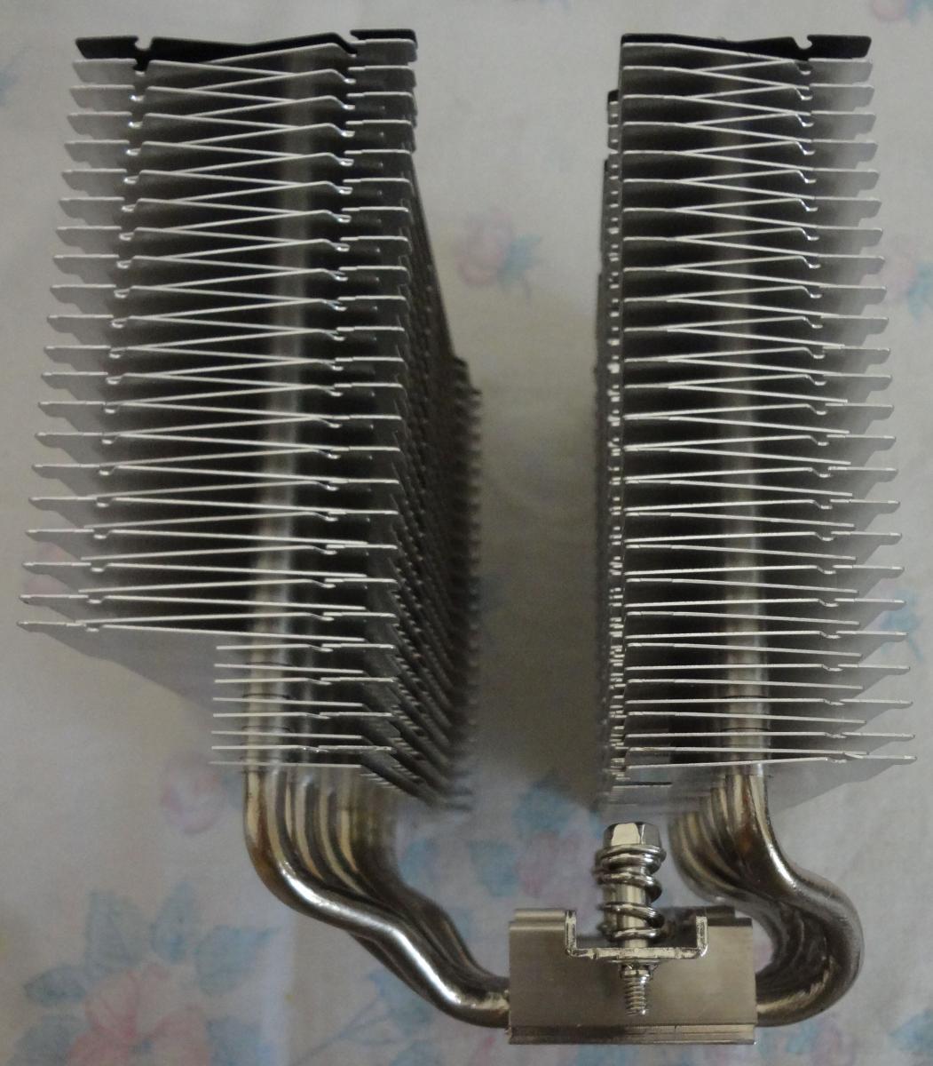 Радиатор набран 82 ребрами (39+43) из полированного алюминия, толщиной 0.4мм с межреберным расстоянием 2.0мм на 6х6мм никелированных теплотрубках. Ребра радиатора просто обжаты на теплотрубках.