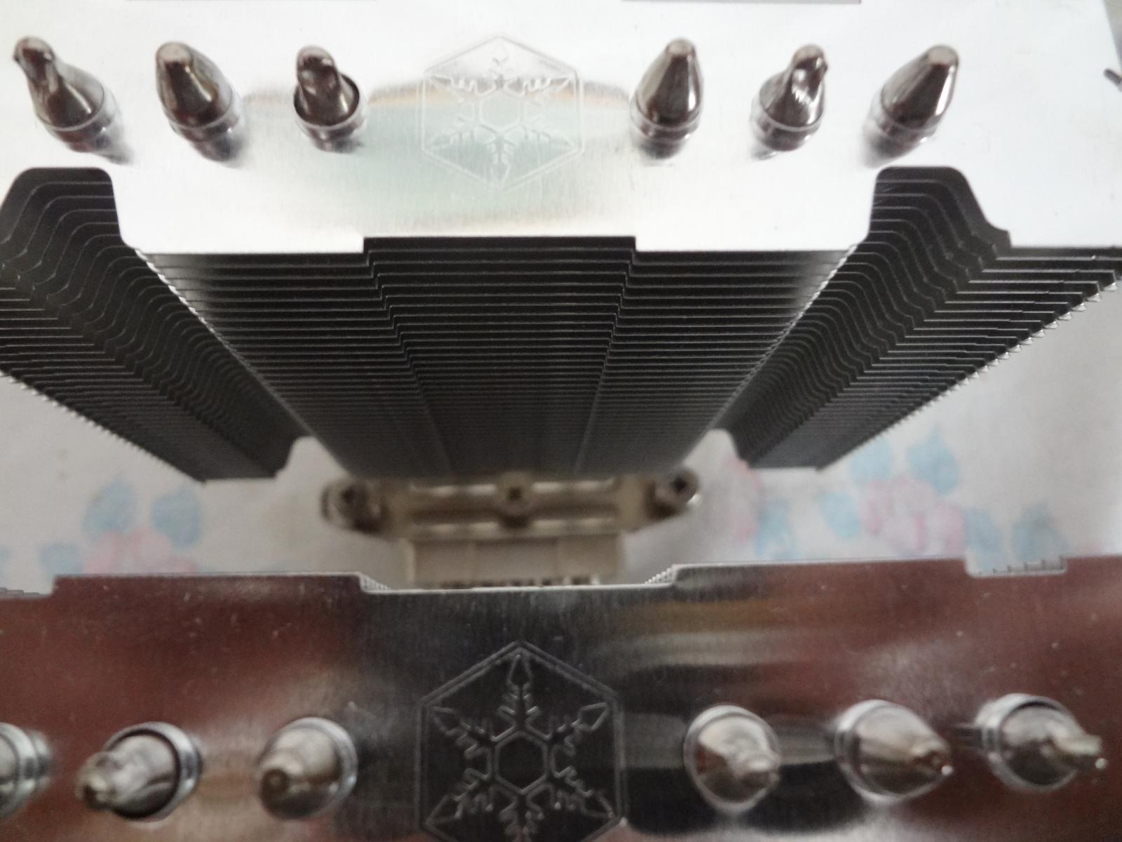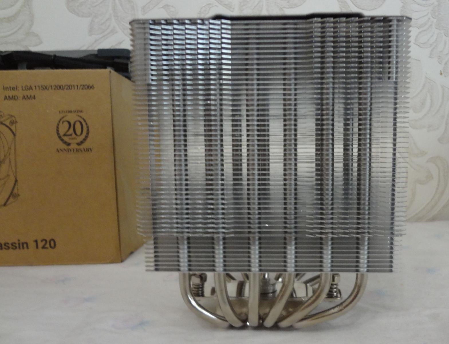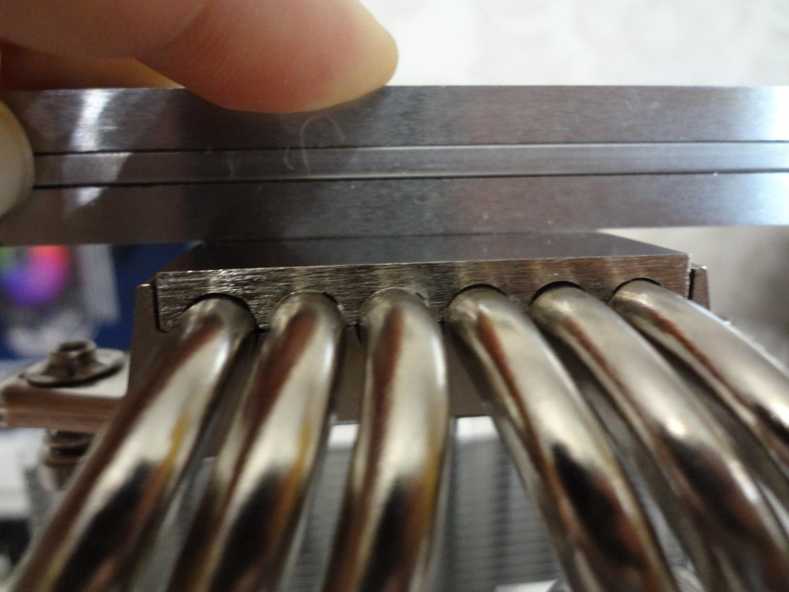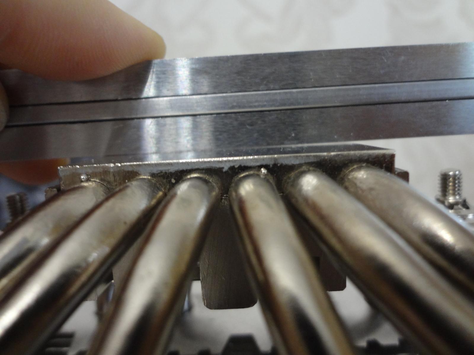 Радиатор набран 82 ребрами (39+43) из полированного алюминия, толщиной 0.4мм с межреберным расстоянием 2.0мм на 6х6мм никелированных теплотрубках. Ребра радиатора просто обжаты на теплотрубках.
