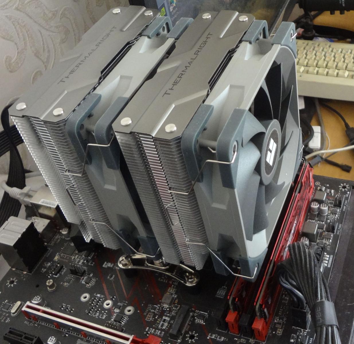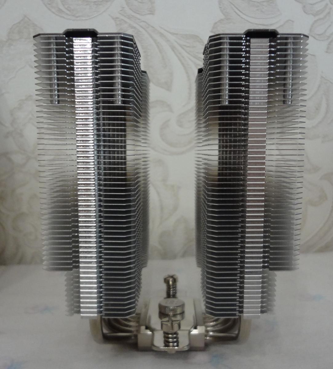 Радиатор состоит из 2-х секций по 53 ребра в каждой (44 больших и 9 малых), опрессованых на 6х6мм никелированных теплотрубках. Радиатор асимметричен, как и у всех моделей Thermalright выпускаемых с 2014г (за некоторым исключением). Прижимная планка закреплена на основании винтом с завода.