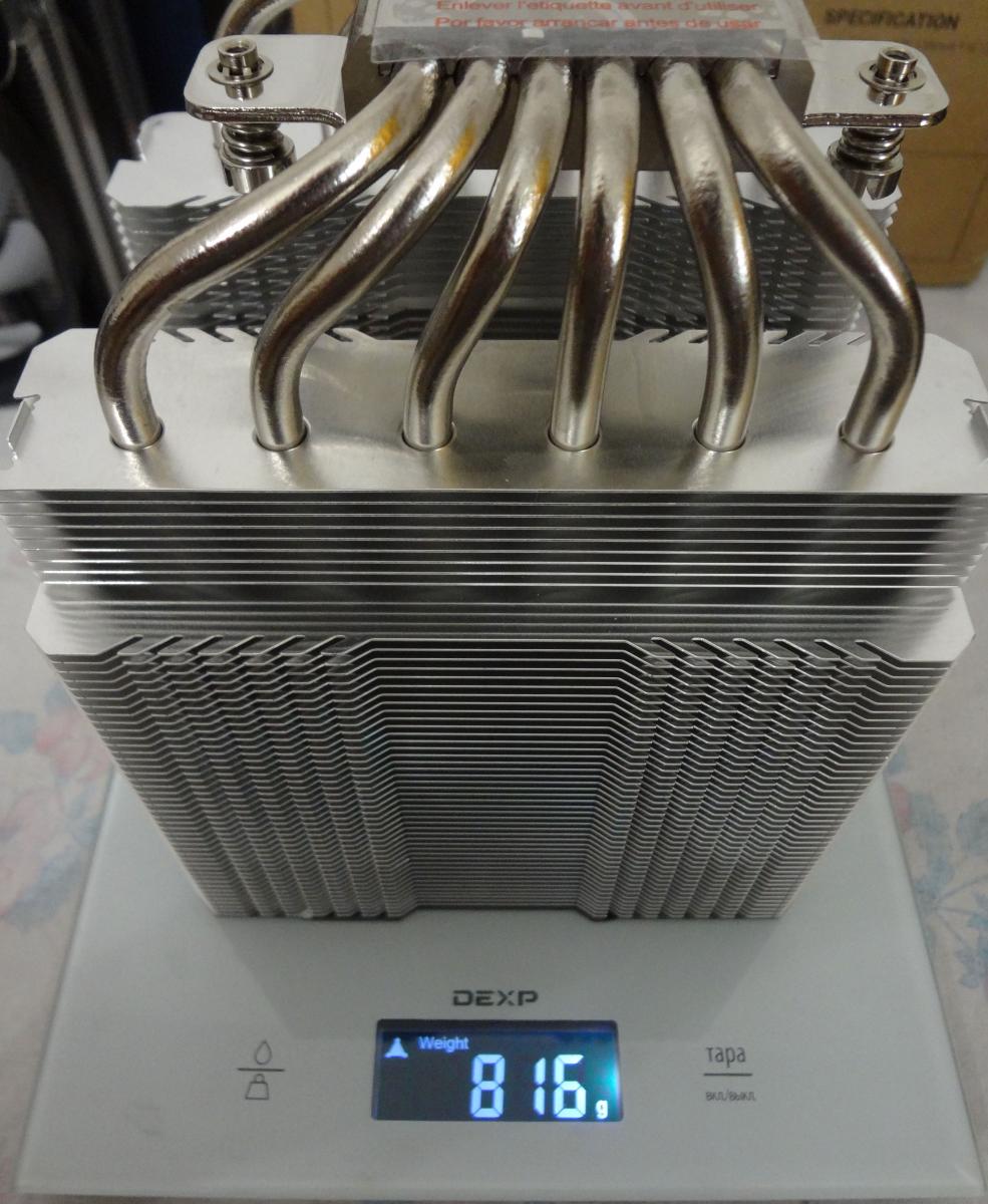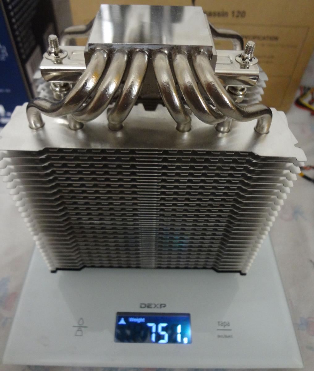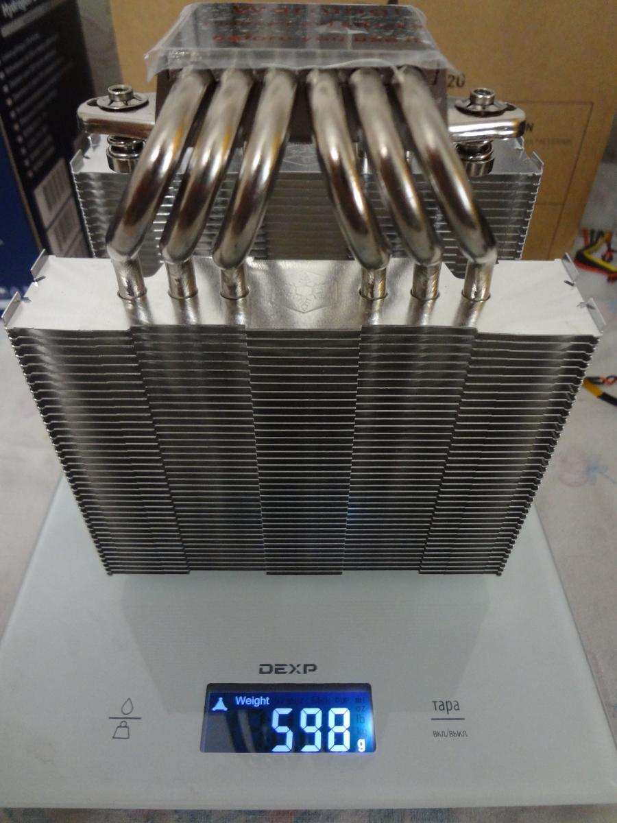 Основание кулера имеет четко выраженный прямо по центру горб - с одной стороны это вроде положительно скажется на системах с процессорами Интел, но вот на системах на АМ4 это уже будет серьезным минусом. Основание качественно пропаяно, без зазоров. Вес чистого радиатора - 750г.