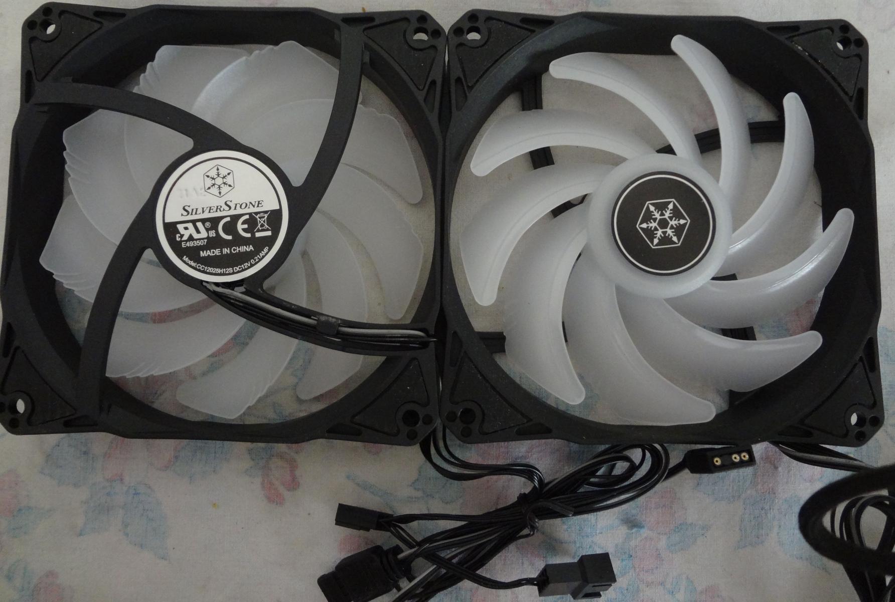Кулер комплектуется двумя "тайфуноподобными" вентиляторами с маркировкой CC12025H12S с ARGB подсветкой на гидродинамическом подшипнике. Корпус вентилятора имеет резиновые изоляторы рядом с крепежными отверстиями. Крыльчатка - 9-лопастная, серповидно изогнутая. Вентиляторы работают в промежутке 3.5-12В (500-2000об/мин).