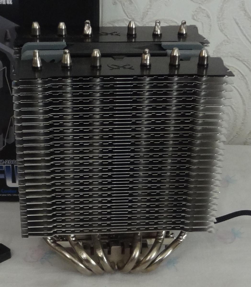 2-х секционный радиатор Фумы 2 имеет смещенный центр тяжести и разные по толщине секции радиатора (подобное решение уже встречалось как в первой модели Фумы, так и у Silverstone Heligon HE-01). Секции набраны 49-тью пластинами толщиной 0.4мм с межреберным расстоянием 2.0мм. Помимо этого ребра имеют разный профиль - для снижения завихрений и направления воздушного потока. Пластины не просто насажены на 6х6мм никелированных теплотрубок, но еще и пропаяны. Подобный профиль был выбран для улучшения совместимости радиатора с оперативной памятью не только на обычных системах, но и на рабочих станциях, имеющих по 8 слотов ОЗУ.