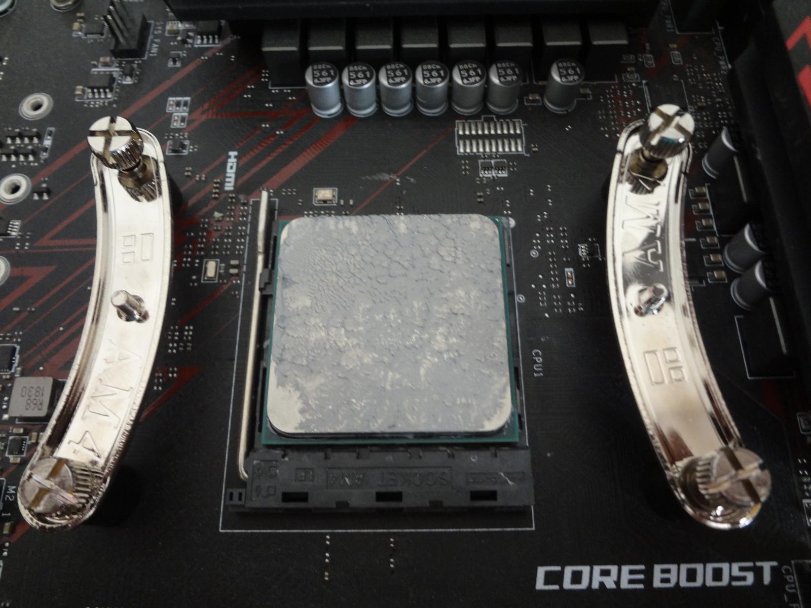 Укладываем крепежные планки и фиксируем их винтами. Стираем старую термопасту, наносим новую и устанавливаем кулер.