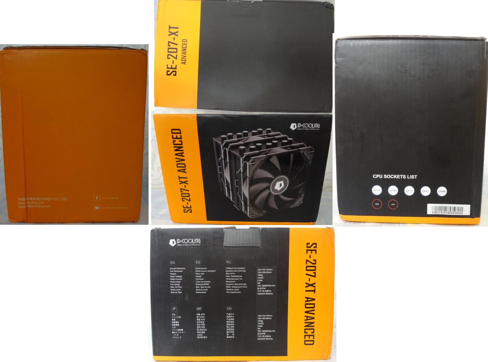Упаковка имеет стандартное черно-оранжевое оформление. На левом боку указаны поддерживаемые сокеты, на задней стороне приведены технические характеристики кулера.