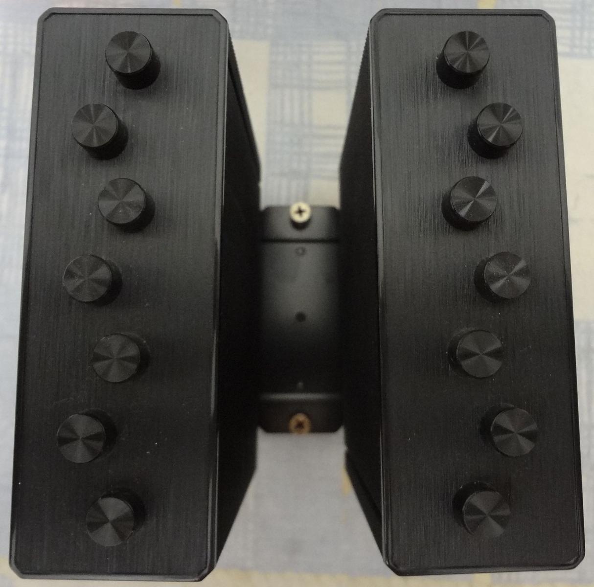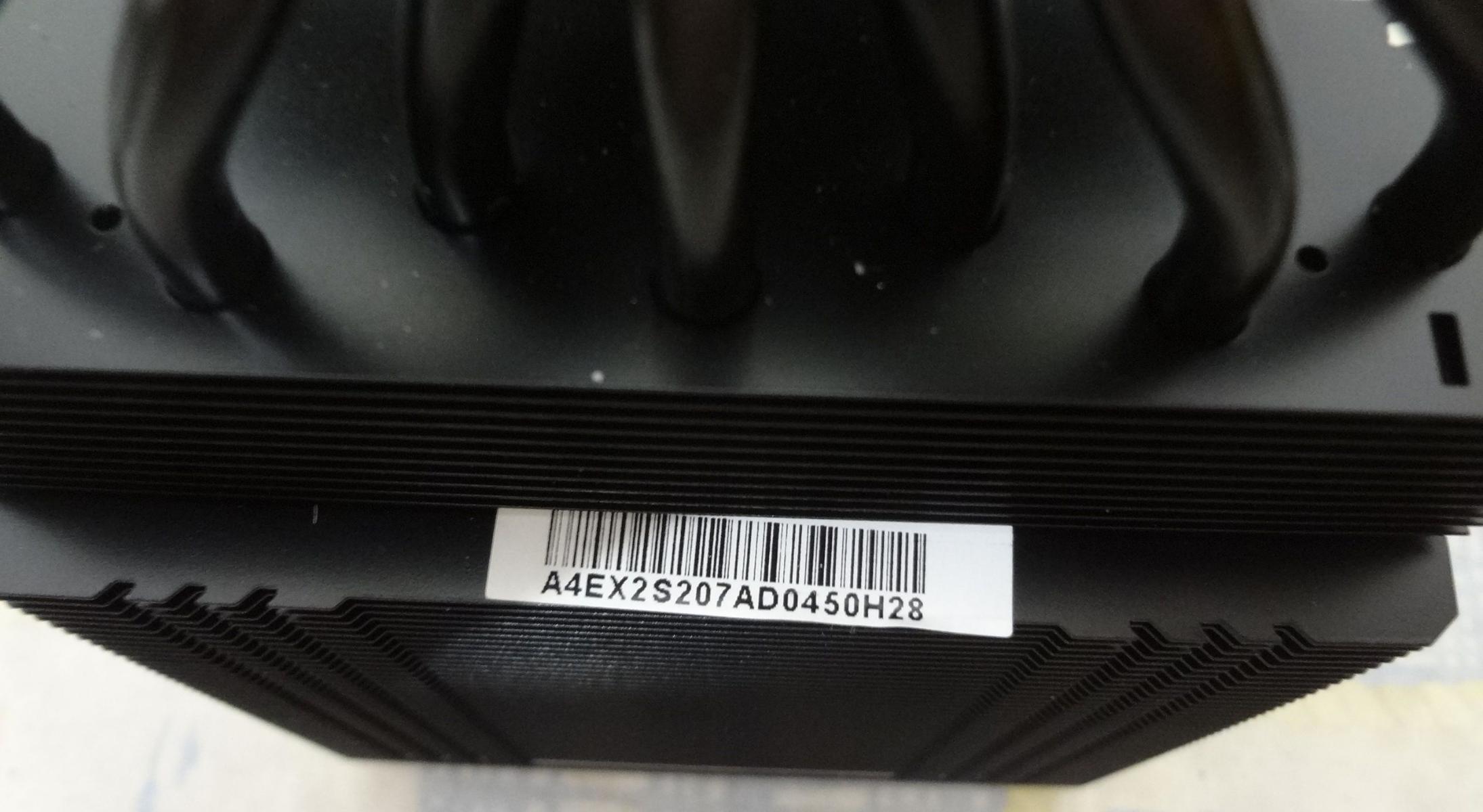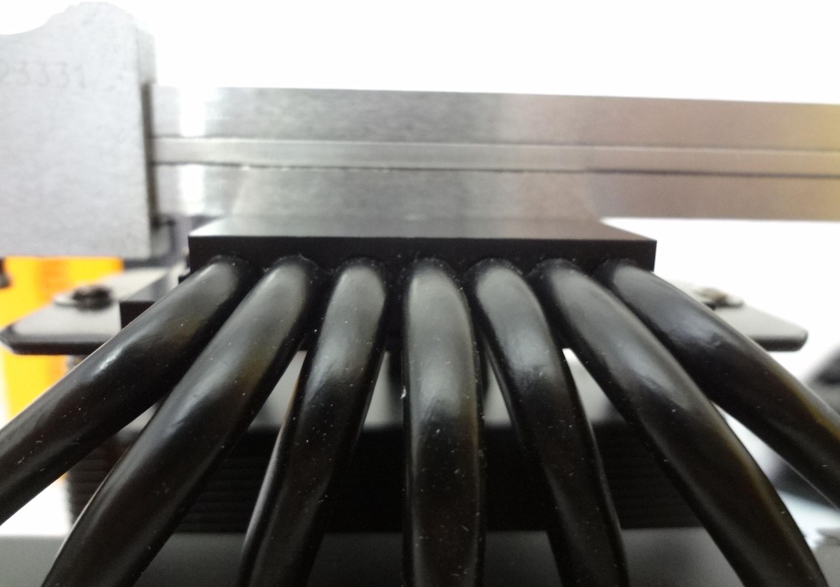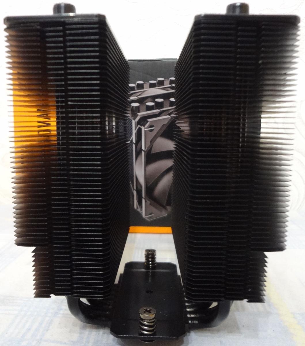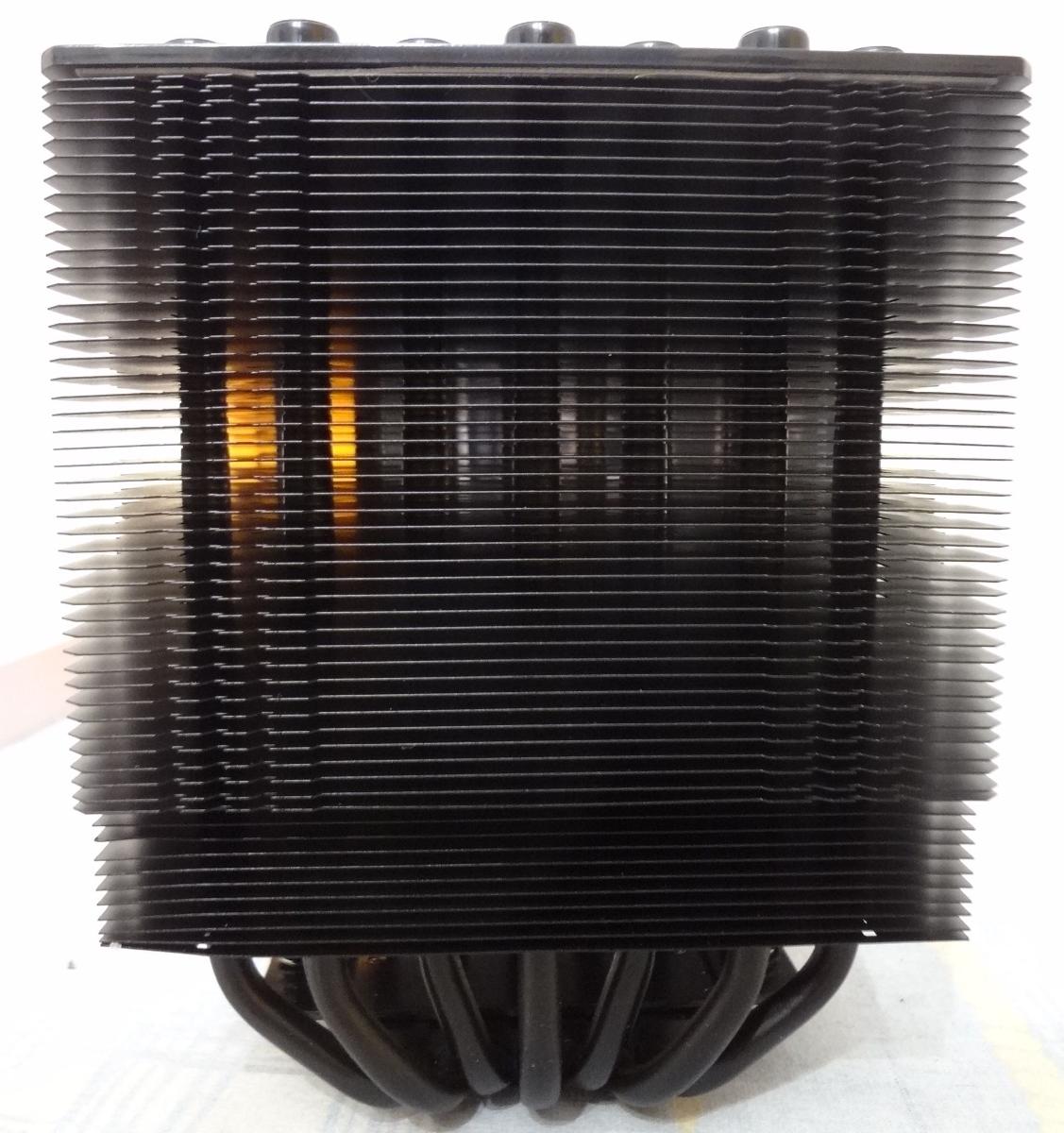 Радиатор покрыт черной краской. Собран на семи 6мм окрашенных теплотрубках, набран двумя секциями по 55 ребер, с межреберным расстоянием 1.8мм. Ребра просто обжаты на теплотрубках.