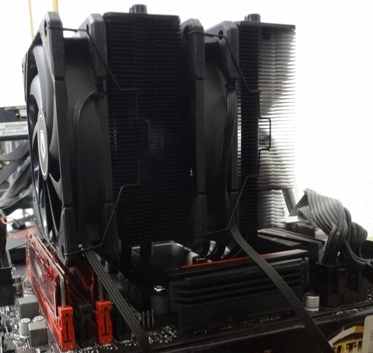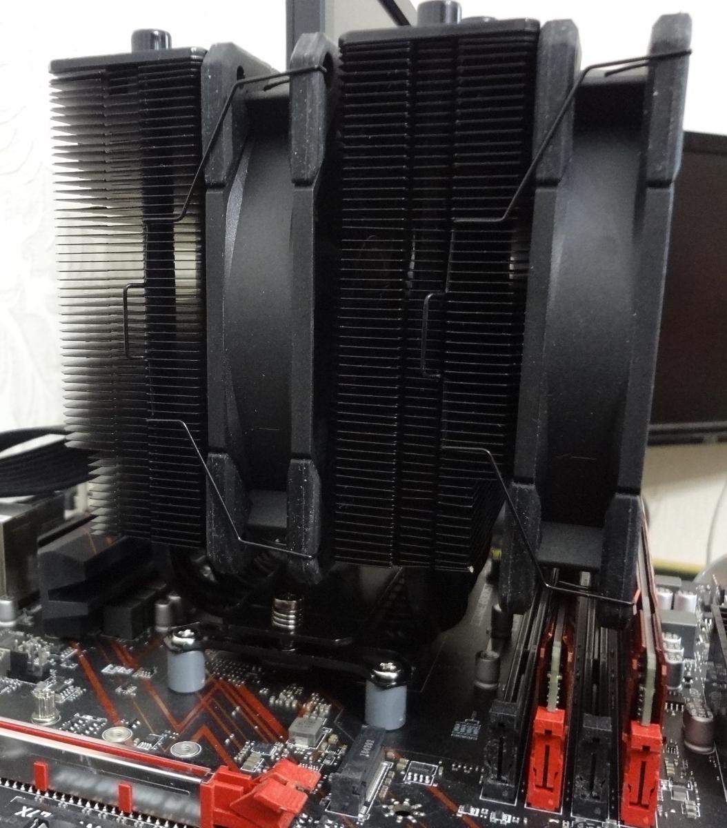 Несмотря на свою компактность, в собранном состоянии кулер перекрывает первые 3 слота оперативной памяти. Скобы крепления вентиляторов удобные, монтаж/демонтаж вентиляторов производится быстро и легко. Качество окраски скоб значительно выше, чем у SE-226-XT.