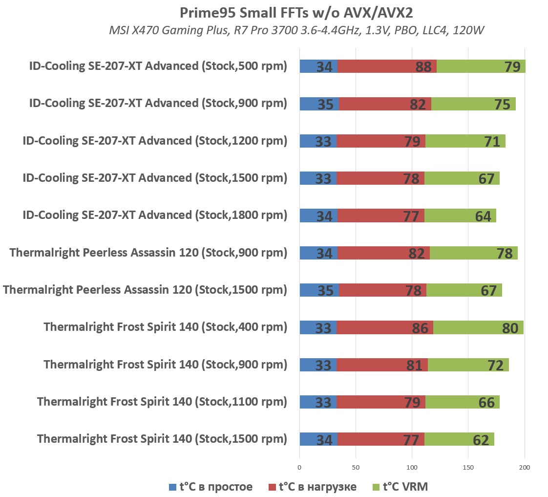 На одинаковых с Peerless Assasin 120 оборотах, новичок показывает равную производительность, что говорит нам о более низком классе данной системы охлаждения, с учетом наличия у нее 7 теплотрубок и вентиляторов, аналогичных TL-C12 Pro.
